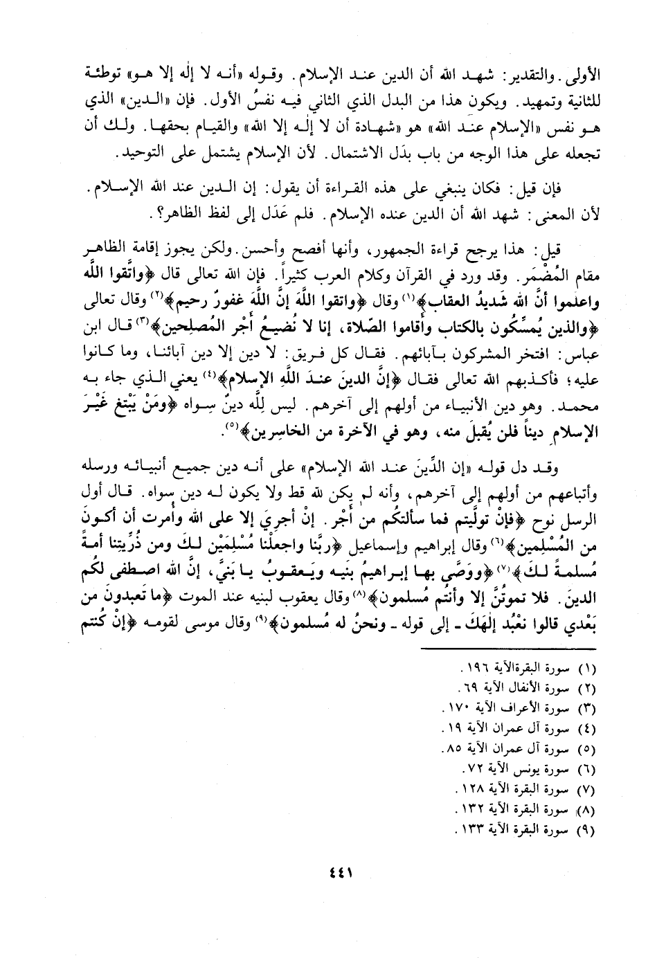 وَقَدْ دَلَّ قَوْلُهُ {إِنَّ الدِّينَ عِنْدَ اللَّهِ الْإِسْلَامُ} [آل عمران: 19] عَلَى أَنَّهُ دِينُ جَمِيعِ أَنْبِيَائِهِ وَرُسُلِهِ وَأَتْبَاعِهِ مِنْ أَوَّلِهِمْ إِلَى آخِرِهِمْ، وَأَنَّهُ لَمْ يَكُنْ لِلَّهِ قَطُّ وَلَا يَكُونُ لَهُ دِينٌ سِوَاهُ، قَالَ أَوَّلُ الرُّسُلِ نُوحٌ {فَإِنْ تَوَلَّيْتُمْ فَمَا سَأَلْتُكُمْ مِنْ أَجْرٍ إِنْ أَجْرِيَ إِلَّا عَلَى اللَّهِ وَأُمِرْتُ أَنْ أَكُونَ مِنَ الْمُسْلِمِينَ} [يونس: 72] وَقَالَ إِبْرَاهِيمُ وَإِسْمَاعِيلُ {رَبَّنَا وَاجْعَلْنَا مُسْلِمَيْنِ لَكَ وَمِنْ ذُرِّيَّتِنَا أُمَّةً مُسْلِمَةً لَكَ - وَوَصَّى بِهَا إِبْرَاهِيمُ بَنِيهِ وَيَعْقُوبُ يَابَنِيَّ إِنَّ اللَّهَ اصْطَفَى لَكُمُ الدِّينَ فَلَا تَمُوتُنَّ إِلَّا وَأَنْتُمْ مُسْلِمُونَ} [البقرة: 128 - 132] وَقَالَ يَعْقُوبُ لِبَنِيهِ عِنْدَ الْمَوْتِ {مَا تَعْبُدُونَ مِنْ بَعْدِي قَالُوا نَعْبُدُ إِلَهَكَ} [البقرة: 133]- إِلَى قَوْلِهِ - {وَنَحْنُ لَهُ مُسْلِمُونَ} [البقرة: 133] وَقَالَ مُوسَى لِقَوْمِهِ {إِنْ كُنْتُمْ آمَنْتُمْ بِاللَّهِ فَعَلَيْهِ تَوَكَّلُوا إِنْ كُنْتُمْ مُسْلِمِينَ} [يونس: 84]