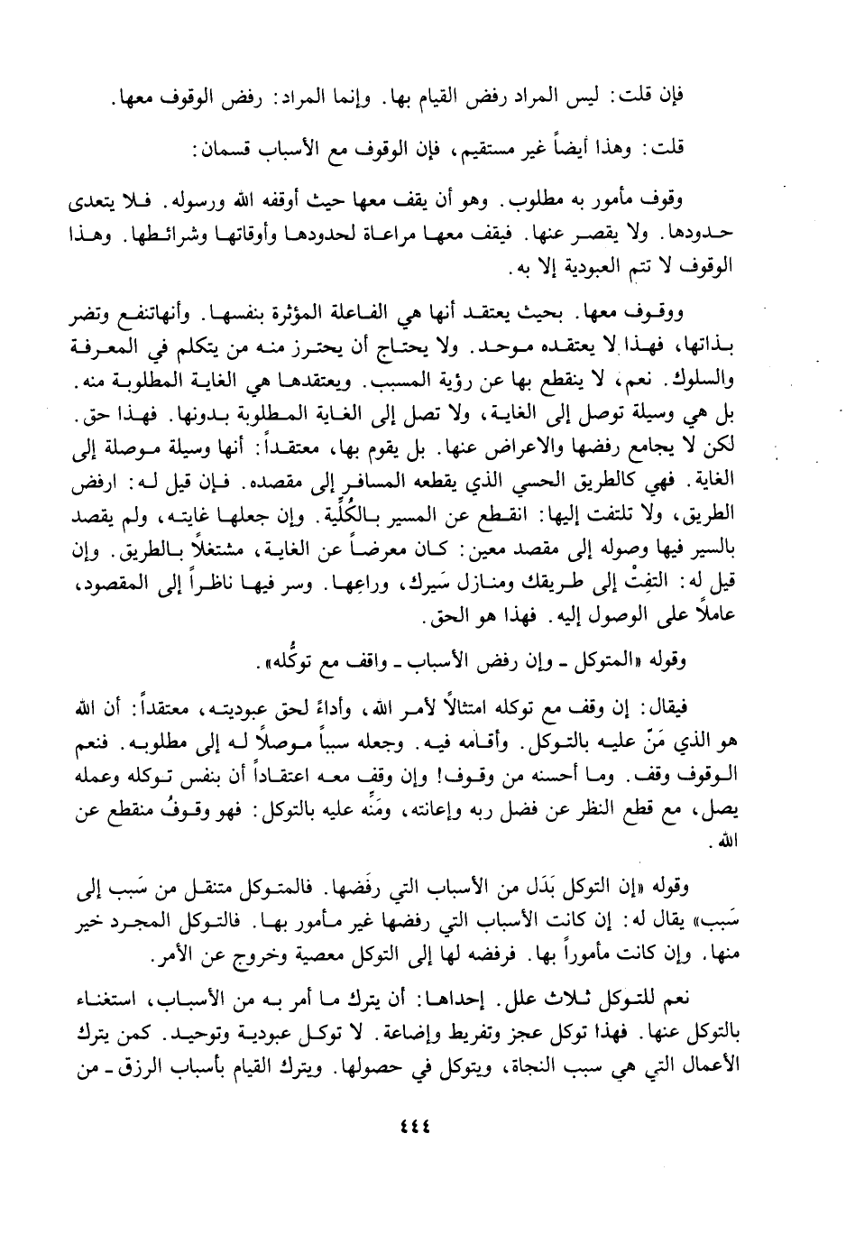 وَقَوْلُهُ: " إِنَّ التَّوَكُّلَ بَدَلٌ مِنَ الْأَسْبَابِ الَّتِي رَفَضَهَا، فَالْمُتَوَكِّلُ مُتَنَقِّلٌ مِنْ سَبَبٍ إِلَى سَبَبٍ يُقَالُ لَهُ: إِنْ كَانَتِ الْأَسْبَابُ الَّتِي رَفَضَهَا غَيْرَ مَأْمُورٍ بِهَا، فَالتَّوَكُّلُ الْمُجَرَّدُ خَيْرٌ مِنْهَا، وَإِنْ كَانَتْ مَأْمُورًا بِهَا، فَرَفْضُهُ لَهَا إِلَى التَّوَكُّلِ مَعْصِيَةٌ وَخُرُوجٌ عَنِ الْأَمْرِ.