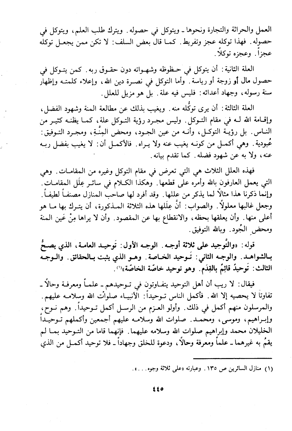 فَهَذِهِ الْعِلَلُ الثَّلَاثُ هِيَ الَّتِي تَعْرِضُ فِي مَقَامِ التَّوَكُّلِ وَغَيْرِهِ مِنَ الْمَقَامَاتِ، وَهِيَ الَّتِي يَعْمَلُ الْعَارِفُونَ بِاللَّهِ وَأَمْرِهِ عَلَى قَطْعِهَا، وَهَكَذَا الْكَلَامُ فِي سَائِرِ عِلَلِ الْمَقَامَاتِ، وَإِنَّمَا ذَكَرْنَا هَذَا مِثَالًا لِمَا يُذْكَرُ مِنْ عِلَلِهَا، وَقَدْ أَفْرَدَ لَهَا صَاحِبُ الْمَنَازِلِ مُصَنَّفًا لَطِيفًا، وَجَعَلَ غَالِبَهَا مَعْلُولًا، وَالصَّوَابُ: أَنَّ عِلَلَهَا هَذِهِ الثَّلَاثَةَ الْمَذْكُورَةَ، أَنْ يَتْرُكَ بِهَا مَا هُوَ أَعْلَى مِنْهَا، وَأَنْ يُعَلِّقَهَا بِحَظِّهِ، وَالِانْقِطَاعِ بِهَا عَنِ الْمَقْصُودِ، وَأَنْ لَا يَرَاهَا مِنْ عَيْنِ الْمِنَّةِ وَمَحْضِ الْجُودِ، وَبِاللَّهِ التَّوْفِيقُ.