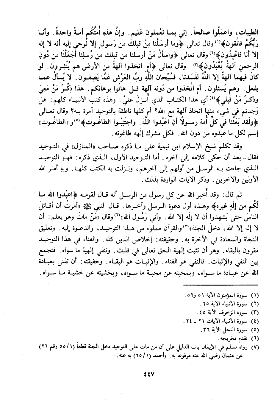 ثُمَّ قَالَ: وَقَدْ أَخْبَرَ اللَّهُ عَنْ كُلِّ رَسُولٍ مِنَ الرُّسُلِ أَنَّهُ قَالَ لِقَوْمِهِ {اعْبُدُوا اللَّهَ مَا لَكُمْ مِنْ إِلَهٍ غَيْرُهُ} [المؤمنون: 32] وَهَذِهِ أَوَّلُ دَعْوَةِ الرُّسُلِ وَآخِرُهَا، قَالَ النَّبِيُّ - صَلَّى اللَّهُ عَلَيْهِ وَسَلَّمَ - «أُمِرْتُ أَنْ أُقَاتِلَ النَّاسَ حَتَّى يَشْهَدُوا أَنْ لَا إِلَهَ إِلَّا اللَّهُ، وَأَنِّي رَسُولُ اللَّهِ» وَقَالَ «مَنْ مَاتَ وَهُوَ يَعْلَمُ أَنْ لَا إِلَهَ إِلَّا اللَّهُ، دَخَلَ الْجَنَّةَ» وَالْقُرْآنُ مَمْلُوءٌ مِنْ هَذَا التَّوْحِيدِ، وَالدَّعْوَةِ إِلَيْهِ، وَتَعْلِيقِ النَّجَاةِ وَالسَّعَادَةِ فِي الْآخِرَةِ بِهِ، وَحَقِيقَتُهُ: إِخْلَاصُ الدِّينِ كُلِّهِ، وَالْفَنَاءُ فِي هَذَا التَّوْحِيدِ مَقْرُونٌ بِالْبَقَاءِ، وَهُوَ أَنْ تُثْبِتَ إِلَهِيَّةَ الْحَقِّ تَعَالَى فِي قَلْبِكَ، وَتَنْفِي إِلَهِيَّةَ مَا سِوَاهُ، فَتَجْمَعُ بَيْنَ النَّفْيِ وَالْإِثْبَاتِ، فَالنَّفْيُ هُوَ الْفَنَاءُ، وَالْإِثْبَاتُ هُوَ الْبَقَاءُ، وَحَقِيقَتُهُ: أَنْ تَفْنَى بِعِبَادَةِ اللَّهِ عَنْ عِبَادَةِ مَا سِوَاهُ، وَبِمَحَبَّتِهِ عَنْ مَحَبَّةِ مَا سِوَاهُ، وَبِخَشْيَتِهِ عَنْ خَشْيَةِ مَا سِوَاهُ،