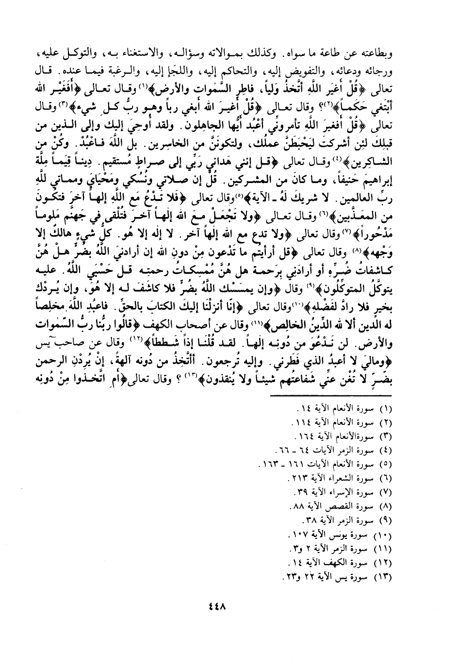 وَبِطَاعَتِهِ عَنْ طَاعَةِ مَا سِوَاهُ، وَكَذَلِكَ بِمُوَالَاتِهِ وَسُؤَالِهِ، وَالِاسْتِغْنَاءِ بِهِ، وَالتَّوَكُّلِ عَلَيْهِ، وَرَجَائِهِ وَدُعَائِهِ، وَالتَّفْوِيضِ إِلَيْهِ، وَالتَّحَاكُمِ إِلَيْهِ، وَاللُّجْءِ إِلَيْهِ، وَالرَّغْبَةِ فِيمَا عِنْدَهُ، قَالَ تَعَالَى {قُلْ أَغَيْرَ اللَّهِ أَتَّخِذُ وَلِيًّا فَاطِرِ السَّمَاوَاتِ وَالْأَرْضِ} [الأنعام: 14] وَقَالَ تَعَالَى {أَفَغَيْرَ اللَّهِ أَبْتَغِي حَكَمًا} [الأنعام: 114] وَقَالَ تَعَالَى {قُلْ أَغَيْرَ اللَّهِ أَبْغِي رَبًّا وَهُوَ رَبُّ كُلِّ شَيْءٍ} [الأنعام: 164] وَقَالَ تَعَالَى {قُلْ أَفَغَيْرَ اللَّهِ تَأْمُرُونِّي أَعْبُدُ أَيُّهَا الْجَاهِلُونَ - وَلَقَدْ أُوحِيَ إِلَيْكَ وَإِلَى الَّذِينَ مِنْ قَبْلِكَ لَئِنْ أَشْرَكْتَ لَيَحْبَطَنَّ عَمَلُكَ وَلَتَكُونَنَّ مِنَ الْخَاسِرِينَ بَلِ اللَّهَ فَاعْبُدْ وَكُنْ مِنَ الشَّاكِرِينَ} [الزمر: 64 - 65] وَقَالَ تَعَالَى {قُلْ إِنَّنِي هَدَانِي رَبِّي إِلَى صِرَاطٍ مُسْتَقِيمٍ دِينًا قِيَمًا مِلَّةَ إِبْرَاهِيمَ حَنِيفًا وَمَا كَانَ مِنَ الْمُشْرِكِينَ - قُلْ إِنَّ صَلَاتِي وَنُسُكِي وَمَحْيَايَ وَمَمَاتِي لِلَّهِ رَبِّ الْعَالَمِينَ} [الأنعام: 161 - 162] لَا شَرِيكَ لَهُ الْآيَةَ، وَقَالَ تَعَالَى {فَلَا تَدْعُ مَعَ اللَّهِ إِلَهًا آخَرَ فَتَكُونَ مِنَ الْمُعَذَّبِينَ} [الشعراء: 213] وَقَالَ تَعَالَى {لَا تَجْعَلْ مَعَ اللَّهِ إِلَهًا آخَرَ فَتُلْقَى فِي جَهَنَّمَ مَلُومًا مَدْحُورًا} [الإسراء: 39] وَقَالَ تَعَالَى {وَلَا تَدْعُ مَعَ اللَّهِ إِلَهًا آخَرَ لَا إِلَهَ إِلَّا هُوَ كُلُّ شَيْءٍ هَالِكٌ إِلَّا وَجْهَهُ} [القصص: 88] وَقَالَ تَعَالَى {قُلْ أَفَرَأَيْتُمْ مَا تَدْعُونَ مِنْ دُونِ اللَّهِ إِنْ أَرَادَنِيَ اللَّهُ بِضُرٍّ هَلْ هُنَّ كَاشِفَاتُ ضُرِّهِ أَوْ أَرَادَنِي بِرَحْمَةٍ هَلْ هُنَّ مُمْسِكَاتُ رَحْمَتِهِ قُلْ حَسْبِيَ اللَّهُ عَلَيْهِ يَتَوَكَّلُ الْمُتَوَكِّلُونَ} [الزمر: 38] وَقَالَ {وَإِنْ يَمْسَسْكَ اللَّهُ بِضُرٍّ فَلَا كَاشِفَ لَهُ إِلَّا هُوَ وَإِنْ يُرِدْكَ بِخَيْرٍ فَلَا رَادَّ لِفَضْلِهِ} [يونس: 107] وَقَالَ تَعَالَى {إِنَّا أَنْزَلْنَا إِلَيْكَ الْكِتَابَ بِالْحَقِّ فَاعْبُدِ اللَّهَ مُخْلِصًا لَهُ الدِّينَ أَلَا لِلَّهِ الدِّينُ الْخَالِصُ} [الزمر: 2] وَقَالَ عَنْ أَصْحَابِ الْكَهْفِ {فَقَالُوا رَبُّنَا رَبُّ السَّمَاوَاتِ وَالْأَرْضِ لَنْ نَدْعُوَ مِنْ دُونِهِ إِلَهًا لَقَدْ قُلْنَا إِذًا شَطَطًا} [الكهف: 14] وَقَالَ عَنْ صَاحِبِ يس {وَمَا لِيَ لَا أَعْبُدُ الَّذِي فَطَرَنِي وَإِلَيْهِ تُرْجَعُونَ أَأَتَّخِذُ مِنْ دُونِهِ آلِهَةً إِنْ يُرِدْنِ الرَّحْمَنُ بِضُرٍّ لَا تُغْنِ عَنِّي شَفَاعَتُهُمْ شَيْئًا وَلَا يُنْقِذُونِ} [يس: 22] وَقَالَ تَعَالَى {أَمِ اتَّخَذُوا مِنْ دُونِهِ أَوْلِيَاءَ فَاللَّهُ هُوَ الْوَلِيُّ} [الشورى: 9]