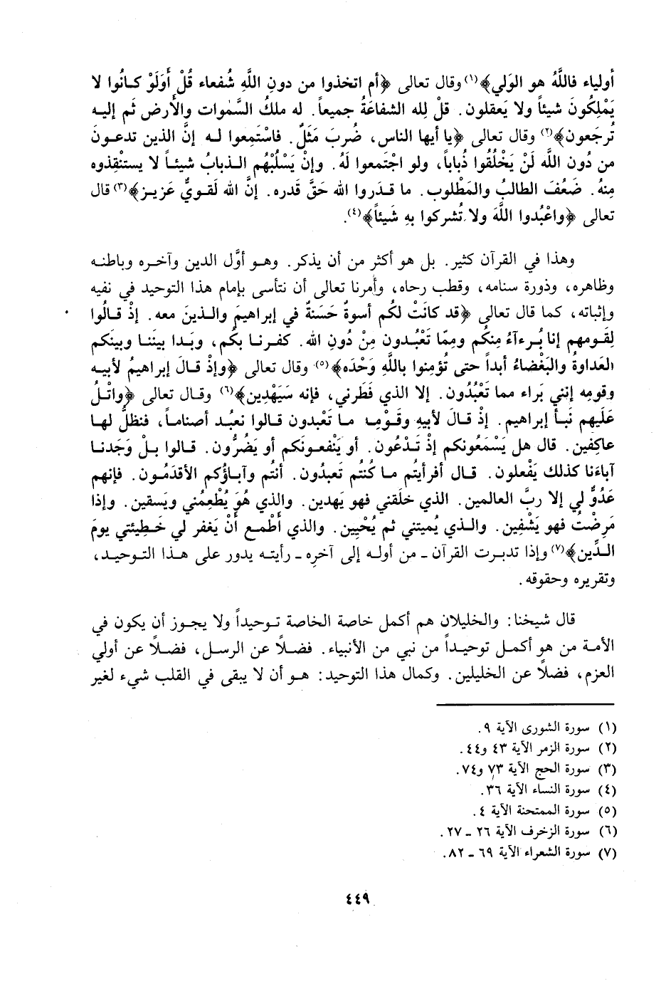 وَهَذَا فِي الْقُرْآنِ كَثِيرٌ، بَلْ هُوَ أَكْثَرُ مِنْ أَنْ يُذْكَرَ، وَهُوَ أَوَّلُ الدِّينِ وَآخِرُهُ وَبَاطِنُهُ وَظَاهِرُهُ، وَذُرْوَةُ سَنَامِهِ، وَقُطْبُ رَحَاهُ، وَأَمَرَنَا تَعَالَى أَنَّ نَتَأَسَّى بِإِمَامِ هَذَا التَّوْحِيدِ فِي نَفْيِهِ وَإِثْبَاتِهِ، كَمَا قَالَ تَعَالَى {قَدْ كَانَتْ لَكُمْ أُسْوَةٌ حَسَنَةٌ فِي إِبْرَاهِيمَ وَالَّذِينَ مَعَهُ إِذْ قَالُوا لِقَوْمِهِمْ إِنَّا بُرَآءُ مِنْكُمْ وَمِمَّا تَعْبُدُونَ مِنْ دُونِ اللَّهِ كَفَرْنَا بِكُمْ وَبَدَا بَيْنَنَا وَبَيْنَكُمُ الْعَدَاوَةُ وَالْبَغْضَاءُ أَبَدًا حَتَّى تُؤْمِنُوا بِاللَّهِ وَحْدَهُ} [الممتحنة: 4] وَقَالَ تَعَالَى {وَإِذْ قَالَ إِبْرَاهِيمُ لِأَبِيهِ وَقَوْمِهِ إِنَّنِي بَرَاءٌ مِمَّا تَعْبُدُونَ إِلَّا الَّذِي فَطَرَنِي فَإِنَّهُ سَيَهْدِينِ} [الزخرف: 26] وَقَالَ تَعَالَى {وَاتْلُ عَلَيْهِمْ نَبَأَ إِبْرَاهِيمَ إِذْ قَالَ لِأَبِيهِ وَقَوْمِهِ مَا تَعْبُدُونَ - قَالُوا نَعْبُدُ أَصْنَامًا فَنَظَلُّ لَهَا عَاكِفِينَ - قَالَ هَلْ يَسْمَعُونَكُمْ إِذْ تَدْعُونَ - أَوْ يَنْفَعُونَكُمْ أَوْ يَضُرُّونَ - قَالُوا بَلْ وَجَدْنَا آبَاءَنَا كَذَلِكَ يَفْعَلُونَ - قَالَ أَفَرَأَيْتُمْ مَا كُنْتُمْ تَعْبُدُونَ - أَنْتُمْ وَآبَاؤُكُمُ الْأَقْدَمُونَ - فَإِنَّهُمْ عَدُوٌّ لِي إِلَّا رَبَّ الْعَالَمِينَ - الَّذِي خَلَقَنِي فَهُوَ يَهْدِينِ - وَالَّذِي هُوَ يُطْعِمُنِي وَيَسْقِينِ - وَإِذَا مَرِضْتُ فَهُوَ يَشْفِينِ - وَالَّذِي يُمِيتُنِي ثُمَّ يُحْيِينِ - وَالَّذِي أَطْمَعُ أَنْ يَغْفِرَ لِي خَطِيئَتِي يَوْمَ الدِّينِ} [الشعراء: 69 - 82] وَإِذَا تَدَبَّرْتَ الْقُرْآنَ - مِنْ أَوَّلِهِ إِلَى آخِرِهِ - رَأَيْتَهُ يَدُورُ عَلَى هَذَا التَّوْحِيدِ، وَتَقْرِيرِهِ وَحُقُوقِهِ.