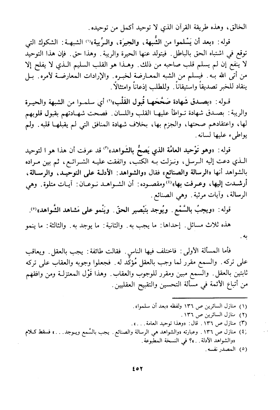 قَوْلُهُ: " وَهُوَ تَوْحِيدُ الْعَامَّةِ الَّذِي يَصِحُّ بِالشَّوَاهِدِ، قَدْ عَرَفْتَ أَنَّ هَذَا هُوَ التَّوْحِيدُ الَّذِي دَعَتْ إِلَيْهِ الرُّسُلُ، وَنَزَلَتْ بِهِ الْكُتُبُ، وَاتَّفَقَتْ عَلَيْهِ الشَّرَائِعُ، ثُمَّ بَيَّنَ مُرَادَهُ بِالشَّوَاهِدِ أَنَّهَا الرِّسَالَةُ وَالصَّنَائِعُ، فَقَالَ: " وَالشَّوَاهِدُ: الْأَدِلَّةُ عَلَى التَّوْحِيدِ، وَالرِّسَالَةُ أَرْشَدَتْ إِلَيْهَا، وَعُرِفَتْ بِهَا، وَمَقْصُودُهُ: أَنَّ الشَّوَاهِدَ نَوْعَانِ: آيَاتٌ مَتْلُوَّةٌ، وَهِيَ الرِّسَالَةُ، وَآيَاتٌ مَرْئِيَّةٌ، وَهِيَ الصَّنَائِعُ.