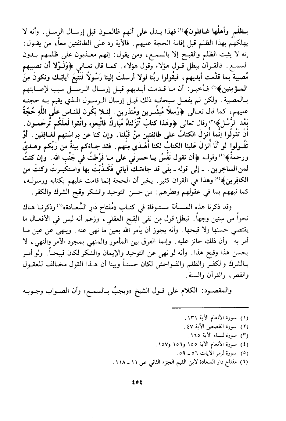 فَهَذَا يَدُلُّ عَلَى أَنَّهُمْ ظَالِمُونَ قَبْلَ إِرْسَالِ الرُّسُلِ، وَأَنَّهُ لَا يُهْلِكُهُمْ بِهَذَا الظُّلْمِ قَبْلَ إِقَامَةِ الْحُجَّةِ عَلَيْهِمْ، فَالْآيَةُ رَدٌّ عَلَى الطَّائِفَتَيْنِ مَعًا، مَنْ يَقُولُ: إِنَّهُ لَا يَثْبُتُ الظُّلْمُ وَالْقُبْحُ إِلَّا بِالسَّمْعِ، وَمَنْ يَقُولُ: إِنَّهُمْ مُعَذَّبُونَ عَلَى ظُلْمِهِمْ بِدُونِ السَّمْعِ، فَالْقُرْآنُ يُبْطِلُ قَوْلَ هَؤُلَاءِ وَقَوْلَ هَؤُلَاءِ، كَمَا قَالَ تَعَالَى {وَلَوْلَا أَنْ تُصِيبَهُمْ مُصِيبَةٌ بِمَا قَدَّمَتْ أَيْدِيهِمْ فَيَقُولُوا رَبَّنَا لَوْلَا أَرْسَلْتَ إِلَيْنَا رَسُولًا فَنَتَّبِعَ آيَاتِكَ وَنَكُونَ مِنَ الْمُؤْمِنِينَ} [القصص: 47] فَأَخْبَرَ: أَنَّ مَا قَدَّمَتْ أَيْدِيهِمْ قَبْلَ إِرْسَالِ الرُّسُلِ سَبَبٌ لِإِصَابَتِهِمْ بِالْمُصِيبَةِ، وَلَكِنْ لَمْ يَفْعَلْ سُبْحَانَهُ ذَلِكَ قَبْلَ إِرْسَالِ الرَّسُولِ الَّذِي يُقِيمُ بِهِ حُجَّتَهُ عَلَيْهِمْ، كَمَا قَالَ تَعَالَى {رُسُلًا مُبَشِّرِينَ وَمُنْذِرِينَ لِئَلَّا يَكُونَ لِلنَّاسِ عَلَى اللَّهِ حُجَّةٌ بَعْدَ الرُّسُلِ} [النساء: 165] وَقَالَ تَعَالَى {وَهَذَا كِتَابٌ أَنْزَلْنَاهُ مُبَارَكٌ فَاتَّبِعُوهُ وَاتَّقُوا لَعَلَّكُمْ تُرْحَمُونَ - أَنْ تَقُولُوا إِنَّمَا أُنْزِلَ الْكِتَابُ عَلَى طَائِفَتَيْنِ مِنْ قَبْلِنَا وَإِنْ كُنَّا عَنْ دِرَاسَتِهِمْ لَغَافِلِينَ - أَوْ تَقُولُوا لَوْ أَنَّا أُنْزِلَ عَلَيْنَا الْكِتَابُ لَكُنَّا أَهْدَى مِنْهُمْ فَقَدْ جَاءَكُمْ بَيِّنَةٌ مِنْ رَبِّكُمْ وَهُدًى وَرَحْمَةٌ} [الأنعام: 155 - 157] وَقَوْلُهُ {أَنْ تَقُولَ نَفْسٌ يَا حَسْرَتَى عَلَى مَا فَرَّطْتُ فِي جَنْبِ اللَّهِ وَإِنْ كُنْتُ لَمِنَ السَّاخِرِينَ} [الزمر: 56]- إِلَى قَوْلِهِ - {بَلَى قَدْ جَاءَتْكَ آيَاتِي فَكَذَّبْتَ بِهَا وَاسْتَكْبَرْتَ وَكُنْتَ مِنَ الْكَافِرِينَ} [الزمر: 59] وَهَذَا فِي الْقُرْآنِ كَثِيرٌ، يُخْبِرُ أَنَّ الْحُجَّةَ إِنَّمَا قَامَتْ عَلَيْهِمْ بِكِتَابِهِ وَرَسُولِهِ، كَمَا نَبَّهَهُمْ بِمَا فِي عُقُولِهِمْ وَفِطَرِهِمْ: مِنْ حُسْنِ التَّوْحِيدِ وَالشُّكْرِ، وَقُبْحِ الشِّرْكِ وَالْكُفْرِ.