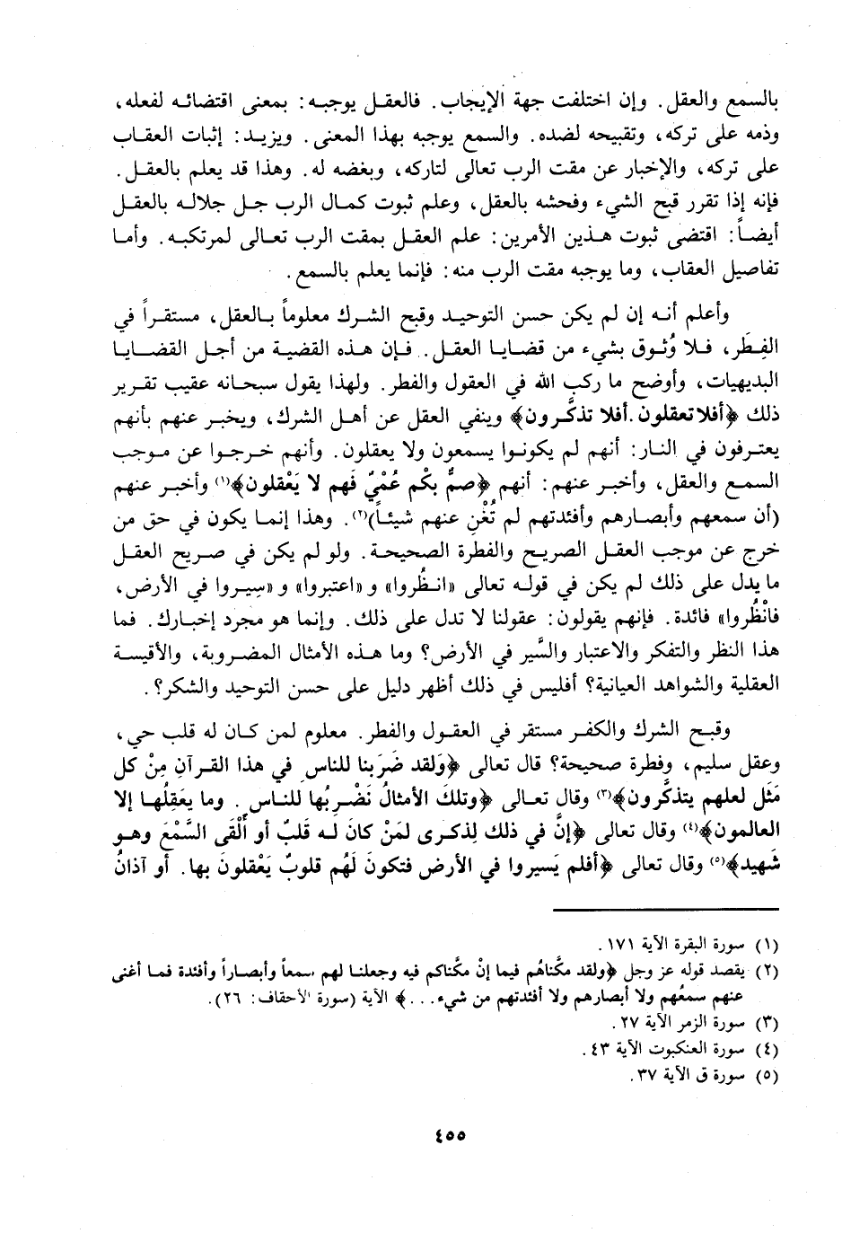 وَقُبْحُ الشِّرْكِ وَالْكُفْرِ مُسْتَقِرٌّ فِي الْعُقُولِ وَالْفِطَرِ، مَعْلُومٌ لِمَنْ كَانَ لَهُ قَلْبٌ حَيٌّ، وَعَقْلٌ سَلِيمٌ، وَفِطْرَةٌ صَحِيحَةٌ؟ قَالَ تَعَالَى {وَلَقَدْ ضَرَبْنَا لِلنَّاسِ فِي هَذَا الْقُرْآنِ مِنْ كُلِّ مَثَلٍ لَعَلَّهُمْ يَتَذَكَّرُونَ} [الزمر: 27] وَقَالَ تَعَالَى {وَتِلْكَ الْأَمْثَالُ نَضْرِبُهَا لِلنَّاسِ وَمَا يَعْقِلُهَا إِلَّا الْعَالِمُونَ} [العنكبوت: 43] وَقَالَ تَعَالَى {إِنَّ فِي ذَلِكَ لَذِكْرَى لِمَنْ كَانَ لَهُ قَلْبٌ أَوْ أَلْقَى السَّمْعَ وَهُوَ شَهِيدٌ} [ق: 37] وَقَالَ تَعَالَى {أَفَلَمْ يَسِيرُوا فِي الْأَرْضِ فَتَكُونَ لَهُمْ قُلُوبٌ يَعْقِلُونَ بِهَا أَوْ آذَانٌ يَسْمَعُونَ بِهَا فَإِنَّهَا لَا تَعْمَى الْأَبْصَارُ وَلَكِنْ تَعْمَى الْقُلُوبُ الَّتِي فِي الصُّدُورِ} [الحج: 46]