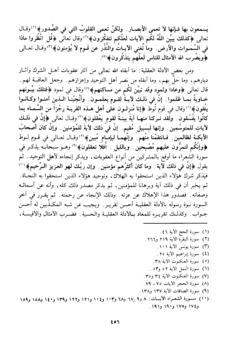 وَمِنْ بَعْضِ الْأَدِلَّةِ الْعَقْلِيَّةِ: مَا أَبْقَاهُ اللَّهُ تَعَالَى مِنْ آثَارِ عُقُوبَاتِ أَهْلِ الشِّرْكِ وَآثَارِ دِيَارِهِمْ، وَمَا حَلَّ بِهِمْ، وَمَا أَبْقَاهُ مِنْ نَصْرِ أَهْلِ التَّوْحِيدِ وَإِعْزَازِهِمْ، وَجَعْلِ الْعَاقِبَةِ لَهُمْ، قَالَ تَعَالَى {وَعَادًا وَثَمُودَ وَقَدْ تَبَيَّنَ لَكُمْ مِنْ مَسَاكِنِهِمْ} [العنكبوت: 38] وَقَالَ فِي ثَمُودَ {فَتِلْكَ بُيُوتُهُمْ خَاوِيَةً بِمَا ظَلَمُوا إِنَّ فِي ذَلِكَ لَآيَةً لِقَوْمٍ يَعْلَمُونَ وَأَنْجَيْنَا الَّذِينَ آمَنُوا وَكَانُوا يَتَّقُونَ} [النمل: 52] وَقَالَ فِي قَوْمِ لُوطٍ {إِنَّا مُنْزِلُونَ عَلَى أَهْلِ هَذِهِ الْقَرْيَةِ رِجْزًا مِنَ السَّمَاءِ بِمَا كَانُوا يَفْسُقُونَ وَلَقَدْ تَرَكْنَا مِنْهَا آيَةً بَيِّنَةً لِقَوْمٍ يَعْقِلُونَ} [العنكبوت: 34] وَقَالَ تَعَالَى {إِنَّ فِي ذَلِكَ لَآيَاتٍ لِلْمُتَوَسِّمِينَ وَإِنَّهَا لَبِسَبِيلٍ مُقِيمٍ إِنَّ فِي ذَلِكَ لَآيَةً لِلْمُؤْمِنِينَ وَإِنْ كَانَ أَصْحَابُ الْأَيْكَةِ لَظَالِمِينَ فَانْتَقَمْنَا مِنْهُمْ وَإِنَّهُمَا لَبِإِمَامٍ مُبِينٍ} [الحجر: 75] وَقَالَ تَعَالَى فِي قَوْمِ لُوطٍ {وَإِنَّكُمْ لَتَمُرُّونَ عَلَيْهِمْ مُصْبِحِينَ وَبِاللَّيْلِ أَفَلَا تَعْقِلُونَ} [الصافات: 137] وَهُوَ سُبْحَانَهُ يَذْكُرُ فِي سُورَةِ الشُّعَرَاءِ مَا أَوْقَعَ بِالْمُشْرِكِينَ مِنْ أَنْوَاعِ الْعُقُوبَاتِ، وَيَذْكُرُ إِنْجَاءَهُ لِأَهْلِ التَّوْحِيدِ، ثُمَّ يَقُولُ {إِنَّ فِي ذَلِكَ لَآيَةً وَمَا كَانَ أَكْثَرُهُمْ مُؤْمِنِينَ وَإِنَّ رَبَّكَ لَهُوَ الْعَزِيزُ الرَّحِيمُ} [الشعراء: 8] فَيَذْكُرُ شِرْكَ هَؤُلَاءِ الَّذِينَ اسْتَحَقُّوا بِهِ الْهَلَاكَ، وَتَوْحِيدَ هَؤُلَاءِ الَّذِينَ اسْتَحَقُّوا بِهِ النَّجَاةَ، ثُمَّ يُخْبِرُ أَنَّ فِي ذَلِكَ آيَةً وَبُرْهَانًا لِلْمُؤْمِنِينَ، ثُمَّ يَذْكُرُ مَصْدَرَ ذَلِكَ كُلِّهِ، وَأَنَّهُ عَنْ أَسْمَائِهِ وَصِفَاتِهِ، فَصُدُورُ هَذَا الْإِهْلَاكِ عَنْ عِزَّتِهِ، وَذَلِكَ الْإِنْجَاءِ عَنْ رَحْمَتِهِ، ثُمَّ يُقَرِّرُ فِي آخِرِ السُّورَةِ نُبُوَّةَ رَسُولِهِ بِالْأَدِلَّةِ الْعَقْلِيَّةِ أَحْسَنَ تَقْرِيرٍ، وَيُجِيبُ عَنْ شُبَهِ الْمُكَذِّبِينَ لَهُ أَحْسَنَ جَوَابٍ، وَكَذَلِكَ تَقْرِيرُهُ لِلْمَعَادِ بِالْأَدِلَّةِ الْعَقْلِيَّةِ وَالْحِسِّيَّةِ، فَضَرَبَ الْأَمْثَالَ وَالْأَقْيِسَةَ،
