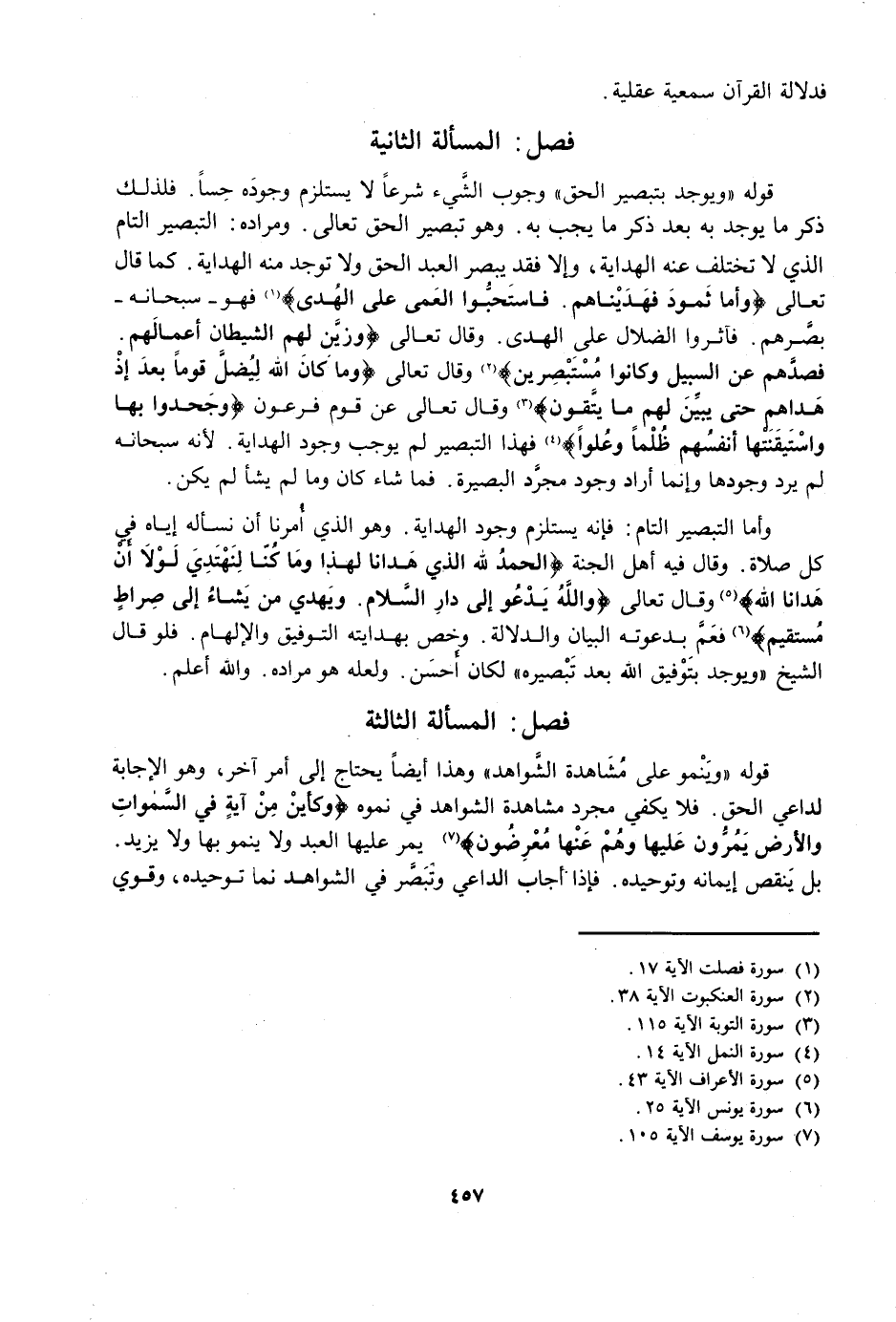 وَأَمَّا التَّبْصِيرُ التَّامُّ: فَإِنَّهُ يَسْتَلْزِمُ وُجُودَ الْهِدَايَةِ، وَهُوَ الَّذِي أَمَرَنَا أَنْ نَسْأَلَهُ إِيَّاهُ فِي كُلِّ صَلَاةٍ، وَقَالَ فِيهِ أَهْلُ الْجَنَّةِ {الْحَمْدُ لِلَّهِ الَّذِي هَدَانَا لِهَذَا وَمَا كُنَّا لِنَهْتَدِيَ لَوْلَا أَنْ هَدَانَا اللَّهُ} [الأعراف: 43] وَقَالَ تَعَالَى {وَاللَّهُ يَدْعُو إِلَى دَارِ السَّلَامِ وَيَهْدِي مَنْ يَشَاءُ إِلَى صِرَاطٍ مُسْتَقِيمٍ} [يونس: 25] فَعَمَّ بِدَعْوَتِهِ الْبَيَانَ وَالدَّلَالَةَ، وَخَصَّ بِهِدَايَتِهِ التَّوْفِيقَ وَالْإِلْهَامَ، فَلَوْ قَالَ الشَّيْخُ: وَيُوجَدُ بِتَوْفِيقِ اللَّهِ بَعْدَ تَبْصِيرِهِ، لَكَانَ أَحْسَنَ، وَلَعَلَّهُ هُوَ مُرَادُهُ، وَاللَّهُ أَعْلَمُ.