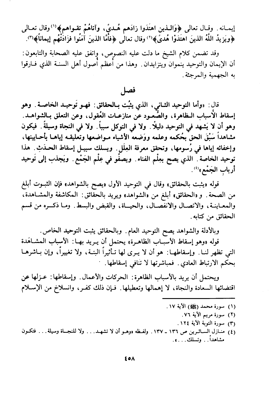 قَالَ: وَأَمَّا التَّوْحِيدُ الثَّانِي، الَّذِي يَثْبُتُ بِالْحَقَائِقِ: فَهُوَ تَوْحِيدُ الْخَاصَّةِ، وَهُوَ إِسْقَاطُ الْأَسْبَابِ الظَّاهِرَةِ، وَالصُّعُودُ عَنْ مُنَازَعَاتِ الْعُقُولِ، وَعَنِ التَّعَلُّقِ بِالشَّوَاهِدِ، وَهُوَ أَنْ لَا يَشْهَدَ فِي التَّوْحِيدِ دَلِيلًا، وَلَا فِي التَّوَكُّلِ سَبَبًا، وَلَا فِي النَّجَاةِ وَسِيلَةً، فَيَكُونُ مُشَاهِدًا سَبْقَ الْحَقِّ بِحُكْمِهِ وَعِلْمِهِ، وَوَضْعِهِ الْأَشْيَاءَ مَوَاضِعَهَا وَتَعْلِيقِهِ إِيَّاهَا بِأَحَايِينِهَا، وَإِخْفَائِهِ إِيَّاهَا فِي رُسُومِهَا، وَتَحَقُّقِ مَعْرِفَةِ الْعِلَلِ، وَيَسْلُكُ سَبِيلَ إِسْقَاطِ الْحَدَثِ، هَذَا تَوْحِيدُ الْخَاصَّةِ، الَّذِي يَصْلُحُ بِعِلْمِ الْفَنَاءِ، وَيَصْفُو فِي عِلْمِ الْجَمْعِ، وَيَجْذِبُ إِلَى تَوْحِيدِ أَرْبَابِ الْجَمْعِ.