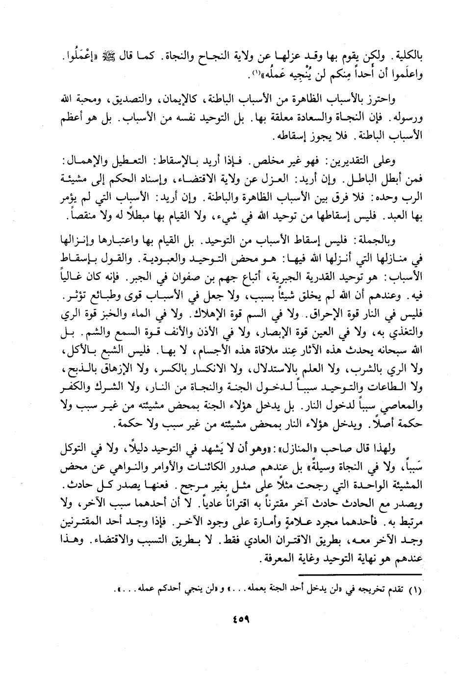 وَبِالْجُمْلَةِ: فَلَيْسَ إِسْقَاطُ الْأَسْبَابِ مِنَ التَّوْحِيدِ، بَلِ الْقِيَامُ بِهَا وَاعْتِبَارُهَا وَإِنْزَالُهَا فِي مَنَازِلِهَا الَّتِي أَنْزَلَهَا اللَّهُ فِيهَا هُوَ مَحْضُ التَّوْحِيدِ وَالْعُبُودِيَّةِ، وَالْقَوْلُ بِإِسْقَاطِ الْأَسْبَابِ هُوَ تَوْحِيدُ الْقَدَرِيَّةِ الْجَبْرِيَّةِ، أَتْبَاعِ جَهْمِ بْنِ صَفْوَانَ فِي الْجَبْرِ، فَإِنَّهُ كَانَ غَالِيًا فِيهِ، وَعِنْدَهُمْ أَنَّ اللَّهَ لَمْ يَخْلُقْ شَيْئًا بِسَبَبٍ، وَلَا جَعَلَ فِي الْأَسْبَابِ قُوًى وَطَبَائِعَ تُؤَثِّرُ، فَلَيْسَ فِي النَّارِ قُوَّةُ الْإِحْرَاقِ، وَلَا فِي السُّمِّ قُوَّةُ الْإِهْلَاكِ، وَلَا فِي الْمَاءِ وَالْخُبْزِ قُوَّةُ الرِّيِّ وَالتَّغَذِّي بِهِ، وَلَا فِي الْعَيْنِ قُوَّةُ الْإِبْصَارِ، وَلَا فِي الْأُذُنِ وَالْأَنْفِ قُوَّةُ السَّمْعِ وَالشَّمِّ، بَلِ اللَّهُ سُبْحَانَهُ يُحْدِثُ هَذِهِ الْآثَارَ عِنْدَ مُلَاقَاةِ هَذِهِ الْأَجْسَامِ، لَا بِهَا، فَلَيْسَ الشِّبَعُ بِالْأَكْلِ، وَلَا الرِّيُّ بِالشُّرْبِ، وَلَا الْعِلْمُ بِالِاسْتِدْلَالِ، وَلَا الِانْكِسَارُ بِالْكَسْرِ، وَلَا الْإِزْهَاقُ بِالذَّبْحِ، وَلَا الطَّاعَاتُ وَالتَّوْحِيدُ سَبَبًا لِدُخُولِ الْجَنَّةِ وَالنَّجَاةِ مِنَ النَّارِ، وَلَا الشِّرْكُ وَالْكَفْرُ وَالْمَعَاصِي سَبَبًا لِدُخُولِ النَّارِ، بَلْ يُدْخِلُ هَؤُلَاءِ الْجَنَّةَ بِمَحْضِ مَشِيئَتِهِ مِنْ غَيْرِ سَبَبٍ وَلَا حِكْمَةٍ أَصْلًا، وَيُدْخِلُ هَؤُلَاءِ النَّارَ بِمَحْضِ مَشِيئَتِهِ مِنْ غَيْرِ سَبَبٍ وَلَا حِكْمَةٍ.