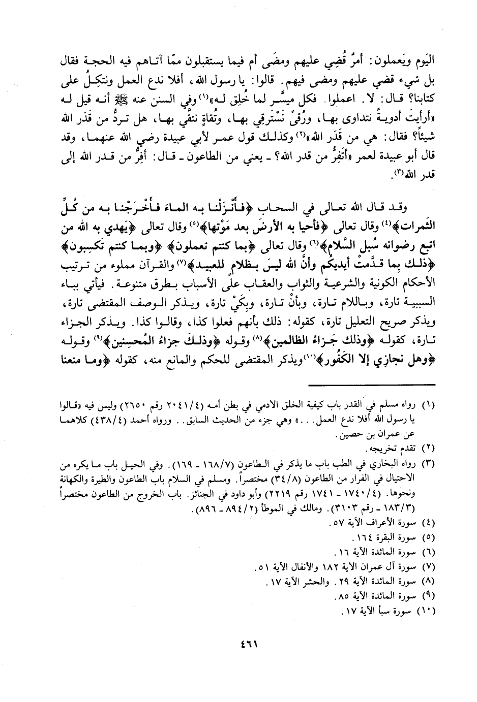 الْيَوْمَ وَيَعْمَلُونَ: أَمْرٌ قُضِيَ عَلَيْهِمْ وَمَضَى، أَمْ فِيمَا يَسْتَقْبِلُونَ مِمَّا آتَاهُمْ فِيهِ الْحُجَّةُ؟ فَقَالَ: بَلْ شَيْءٌ قُضِيَ عَلَيْهِمْ وَمَضَى فِيهِمْ قَالُوا: يَا رَسُولَ اللَّهِ، أَفَلَا نَدَعُ الْعَمَلَ وَنَتَّكِلُ عَلَى كِتَابِنَا؟ قَالَ: لَا، اعْمَلُوا فَكُلٌّ مُيَسَّرٌ لِمَا خُلِقَ لَهُ» وَفِي السُّنَنِ عَنْهُ - صَلَّى اللَّهُ عَلَيْهِ وَسَلَّمَ - أَنَّهُ قِيلَ لَهُ: «أَرَأَيْتَ أَدْوِيَةً نَتَدَاوَى بِهَا، وَرُقًى نَسْتَرْقِي بِهَا، وَتُقَاةً نَتَّقِي بِهَا، هَلْ تَرُدُّ مِنْ قَدَرِ اللَّهِ شَيْئًا؟ فَقَالَ: هِيَ مِنْ قَدَرِ اللَّهِ» وَكَذَلِكَ قَوْلُ عُمَرَ لِأَبِي عُبَيْدَةَ رَضِيَ اللَّهُ عَنْهُمَا، وَقَدْ قَالَ أَبُو عُبَيْدَةَ لِعُمَرَ أَتَفِرُّ مِنْ قَدَرِ اللَّهِ؟ - يَعْنِي مِنَ الطَّاعُونِ - قَالَ: أَفِرُّ مِنْ قَدَرِ اللَّهِ إِلَى قَدَرِ اللَّهِ،