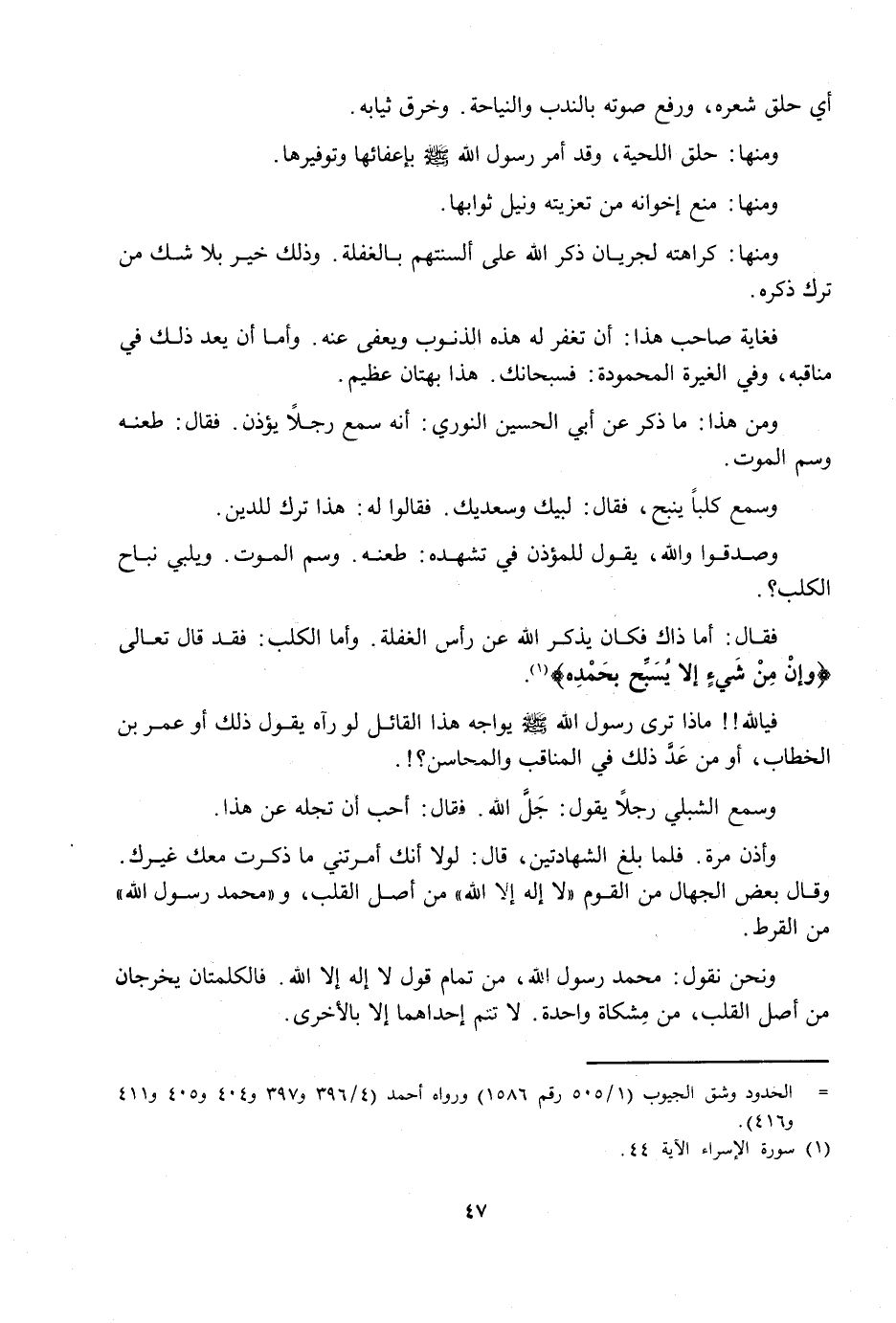 فَقَالَ: أَمَّا ذَاكَ فَكَانَ يَذْكُرُ اللَّهَ عَنْ رَأْسِ الْغَفْلَةِ. وَأَمَّا الْكَلْبُ: فَقَدْ قَالَ تَعَالَى {وَإِنْ مِنْ شَيْءٍ إِلَّا يُسَبِّحُ بِحَمْدِهِ} [الإسراء: 44] .