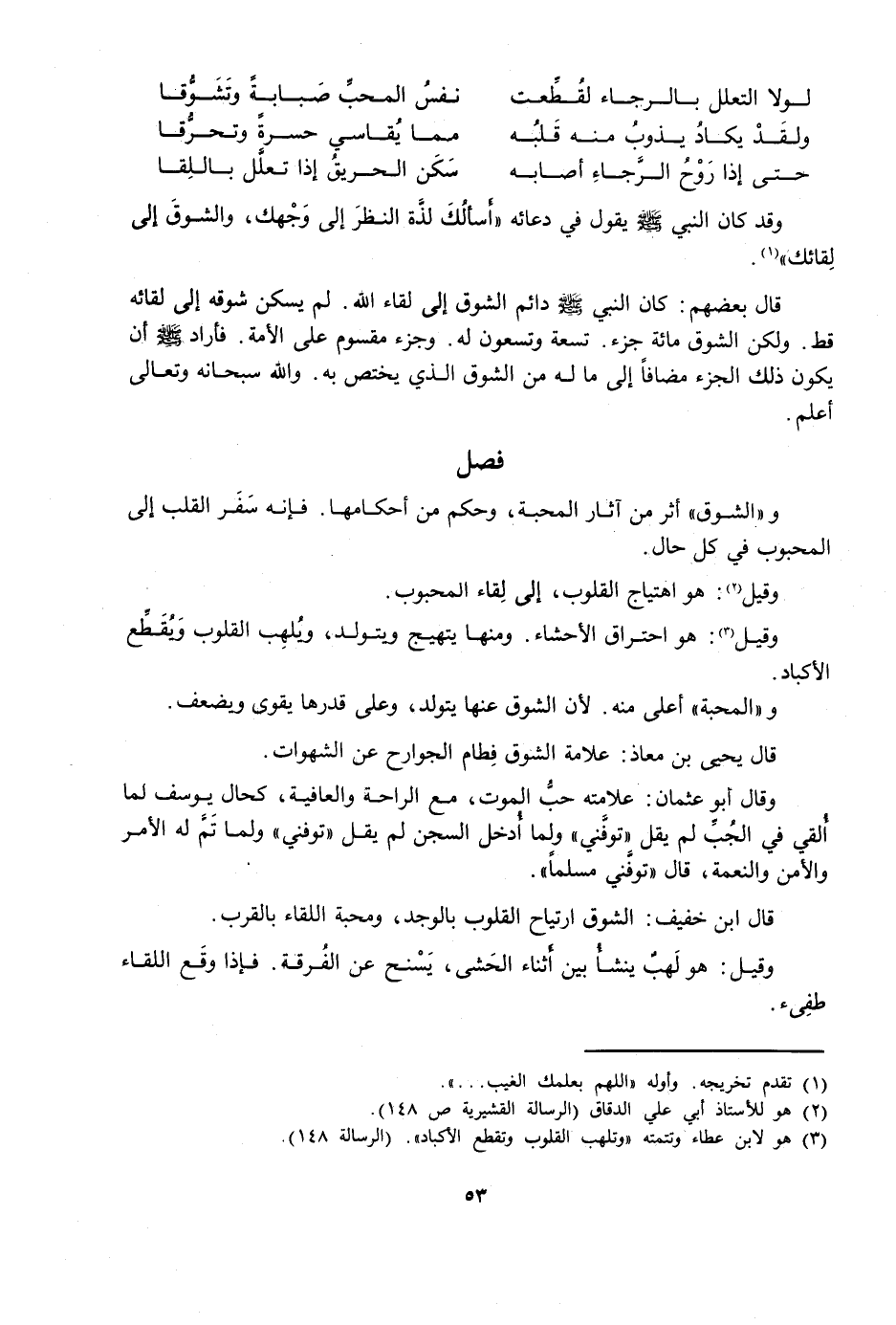 وَالْمَحَبَّةُ أَعْلَى مِنْهُ. لِأَنَّ الشَّوْقَ عَنْهَا يَتَوَلَّدُ، وَعَلَى قَدْرِهَا يَقْوَى وَيَضْعُفُ.