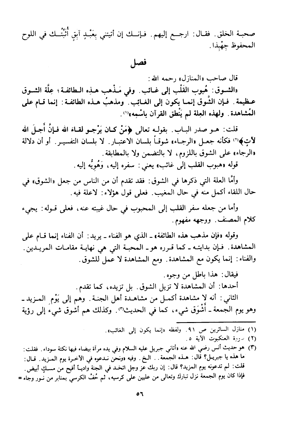 وَقَوْلُهُ " فَإِنَّ مَذْهَبَ هَذِهِ الطَّائِفَةِ " - الَّذِي هُوَ الْفَنَاءُ - يُرِيدُ: أَنَّ الْفَنَاءَ إِنَّمَا قَامَ عَلَى الْمُشَاهَدَةِ. فَإِنَّ بِدَايَتَهُ - كَمَا قَرَّرَهُ هُوَ - الْمَحَبَّةُ الَّتِي هِيَ نِهَايَةُ مَقَامَاتِ الْمُرِيدِينَ. وَالْفَنَاءُ إِنَّمَا يَكُونُ مَعَ الْمُشَاهَدَةِ. وَمَعَ الْمُشَاهَدَةِ لَا عَمَلَ لِلشَّوْقِ.