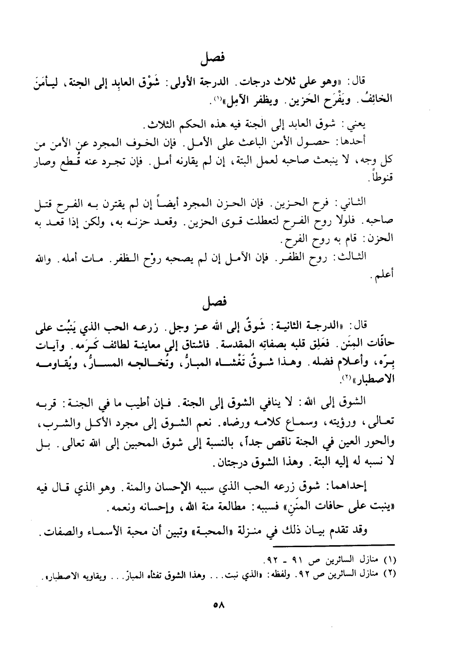 الشَّوْقُ إِلَى اللَّهِ لَا يُنَافِي الشَّوْقَ إِلَى الْجَنَّةِ. فَإِنَّ أَطْيَبَ مَا فِي الْجَنَّةِ: قُرْبُهُ تَعَالَى، وَرُؤْيَتُهُ، وَسَمَاعُ كَلَامِهِ وَرِضَاهُ. نَعَمْ. الشَّوْقُ إِلَى مُجَرَّدِ الْأَكْلِ وَالشُّرْبِ وَالْحُورِ الْعِينِ فِي الْجَنَّةِ نَاقِصٌ جِدًّا، بِالنِّسْبَةِ إِلَى شَوْقِ الْمُحِبِّينَ إِلَى اللَّهِ تَعَالَى. بَلْ لَا نِسْبَةَ لَهُ إِلَيْهِ أَلْبَتَّةَ. وَهَذَا الشَّوْقُ دَرَجَتَانِ.