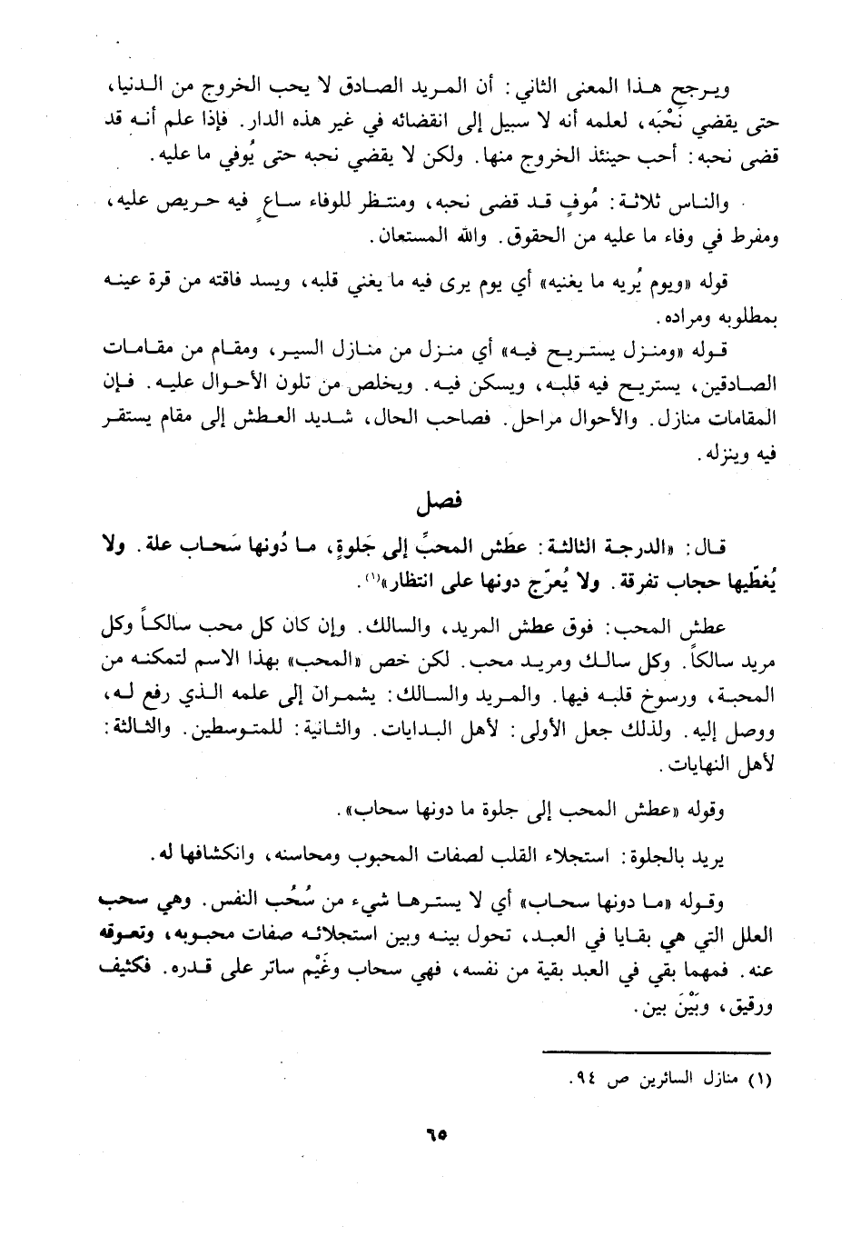 قَالَ: الدَّرَجَةُ الثَّالِثَةُ: عَطَشُ الْمُحِبِّ إِلَى جَلْوَةٍ، مَا دُونَهَا سَحَابُ عَلَّةٍ. وَلَا يُغَطِّيهَا حِجَابُ تَفْرِقَةٍ. وَلَا يُعَرَّجُ دُونَهَا عَلَى انْتِظَارٍ.