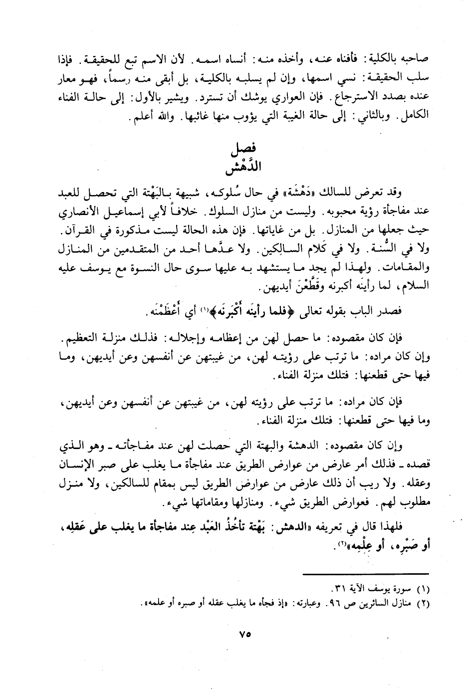 وَقَدْ تَعْرِضُ لِلسَّالِكِ دَهْشَةٌ فِي حَالِ سُلُوكِهِ، شَبِيهَةٌ بِالْبَهْتَةِ الَّتِي تَحْصُلُ لِلْعَبْدِ عِنْدَ مُفَاجَأَةِ رُؤْيَةِ مَحْبُوبِهِ. وَلَيْسَتْ مِنْ مَنَازِلِ السُّلُوكِ. خِلَافًا لِأَبِي إِسْمَاعِيلَ الْأَنْصَارِيِّ حَيْثُ جَعَلَهَا مِنَ الْمَنَازِلِ. بَلْ مِنْ غَايَاتِهَا. فَإِنَّ هَذِهِ الْحَالَةَ لَيْسَتْ مَذْكُورَةً فِي الْقُرْآنِ وَلَا فِي السُّنَّةِ وَلَا فِي كَلَامِ السَّالِكِينَ. وَلَا عَدَّهَا أَحَدٌ مِنَ الْمُتَقَدِّمِينَ مِنَ الْمَنَازِلِ وَالْمَقَامَاتِ. وَلِهَذَا لَمْ يَجِدْ مَا يَسْتَشْهِدُ بِهِ عَلَيْهَا سِوَى حَالِ النِّسْوَةِ مَعَ يُوسُفَ عَلَيْهِ السَّلَامُ، لَمَّا رَأَيْنَهُ أَكْبَرْنَهُ وَقَطَّعْنَ أَيْدِيَهُنَّ.