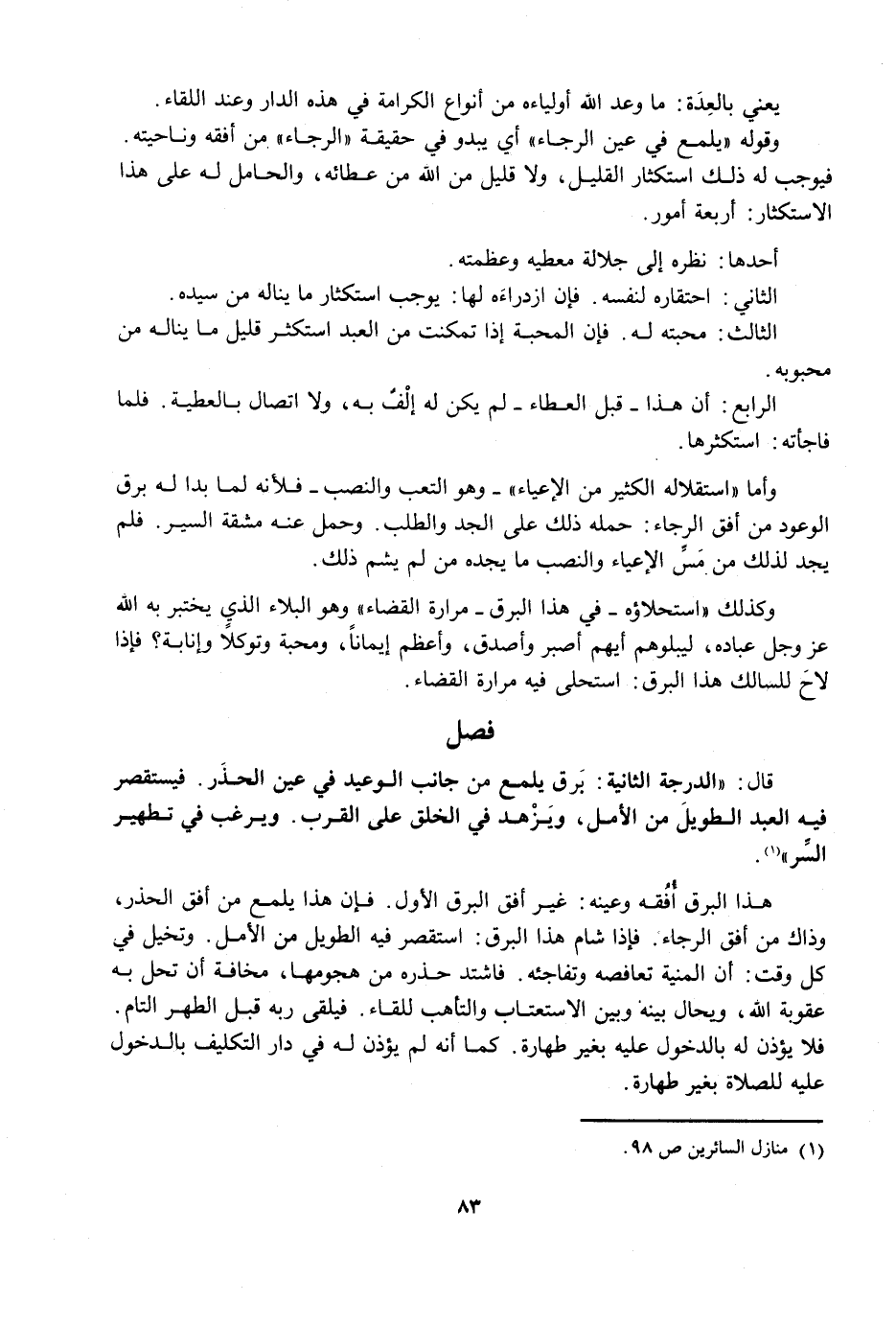 هَذَا الْبَرْقُ أُفُقُهُ وَعَيْنُهُ: غَيْرُ أُفُقِ الْبَرْقِ الْأَوَّلِ. فَإِنَّ هَذَا يَلْمَعُ مِنْ أُفُقِ الْحَذَرِ، وَذَاكَ مِنْ أُفُقِ الرَّجَاءِ. فَإِذَا شَامَ هَذَا الْبَرْقَ: اسْتَقْصَرَ فِيهِ الطَّوِيلَ مِنَ الْأَمَلِ. وَتَخَيَّلَ فِي كُلِّ وَقْتٍ: أَنَّ الْمَنِيَّةَ تُعَافِصَهُ وَتُفَاجِئُهُ.