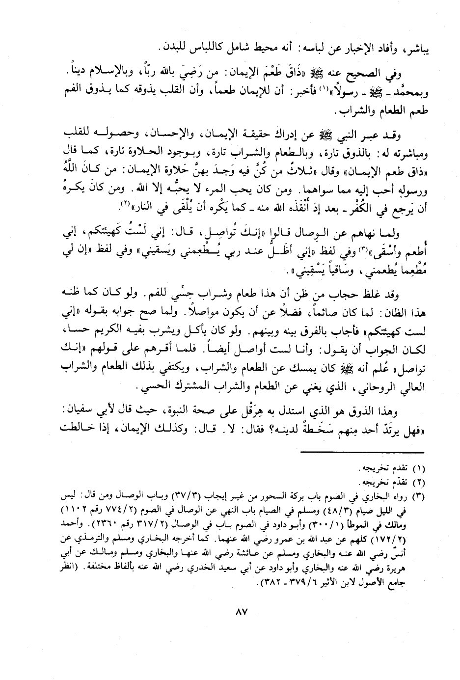وَقَدْ عَبَّرَ النَّبِيُّ - صَلَّى اللَّهُ عَلَيْهِ وَسَلَّمَ - عَنْ إِدْرَاكِ حَقِيقَةِ الْإِيمَانِ، وَالْإِحْسَانِ، وَحُصُولِهِ لِلْقَلْبِ وَمُبَاشَرَتِهِ لَهُ: بِالذَّوْقِ تَارَةً، وَبِالطَّعَامِ وَالشَّرَابِ تَارَةً، وَبِوُجُودِ الْحَلَاوَةِ تَارَةً، كَمَا قَالَ «ذَاقَ طَعْمَ الْإِيمَانِ» وَقَالَ «ثَلَاثٌ مَنْ كُنَّ فِيهِ وَجَدَ بِهِنَّ حَلَاوَةَ الْإِيمَانِ: مَنْ كَانَ اللَّهُ وَرَسُولُهُ أَحَبَّ إِلَيْهِ مِمَّا سِوَاهُمَا. وَمَنْ كَانَ يُحِبُّ الْمَرْءَ لَا يُحِبُّهُ إِلَّا لِلَّهِ. وَمَنْ كَانَ يَكْرَهُ أَنْ يَرْجِعَ فِي الْكُفْرِ - بَعْدَ إِذْ أَنْقَذَهُ اللَّهُ مِنْهُ - كَمَا يَكْرَهُ أَنْ يُلْقَى فِي النَّارِ» .