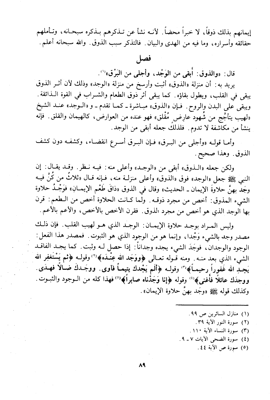 وَلَكِنَّ جَعْلَهُ الذَّوْقَ أَبْقَى مِنَ الْوَجْدِ وَأَعْلَى مِنْهُ: فِيهِ نَظَرٌ. وَقَدْ يُقَالُ: إِنَّ النَّبِيَّ - صَلَّى اللَّهُ عَلَيْهِ وَسَلَّمَ - جَعَلَ الْوَجْدَ فَوْقَ الذَّوْقِ وَأَعْلَى مَنْزِلَةً مِنْهُ، فَإِنَّهُ قَالَ «ثَلَاثٌ مَنْ كُنَّ فِيهِ وَجَدَ بِهِنَّ حَلَاوَةَ الْإِيمَانِ» الْحَدِيثَ، وَقَالَ فِي الذَّوْقِ: ذَاقَ طَعْمَ الْإِيمَانِ، فَوَجْدُ حَلَاوَةِ الشَّيْءِ الْمَذُوقِ: أَخَصُّ مِنْ مُجَرَّدِ ذَوْقِهِ. وَلَمَّا كَانَتِ الْحَلَاوَةُ أَخَصَّ مِنَ الطَّعْمِ: قَرَنَ بِهَا الْوَجْدَ الَّذِي هُوَ أَخَصُّ مِنْ مُجَرَّدِ الذَّوْقِ. فَقَرَنَ الْأَخَصَّ بِالْأَخَصِّ، وَالْأَعَمَّ بِالْأَعَمِّ.