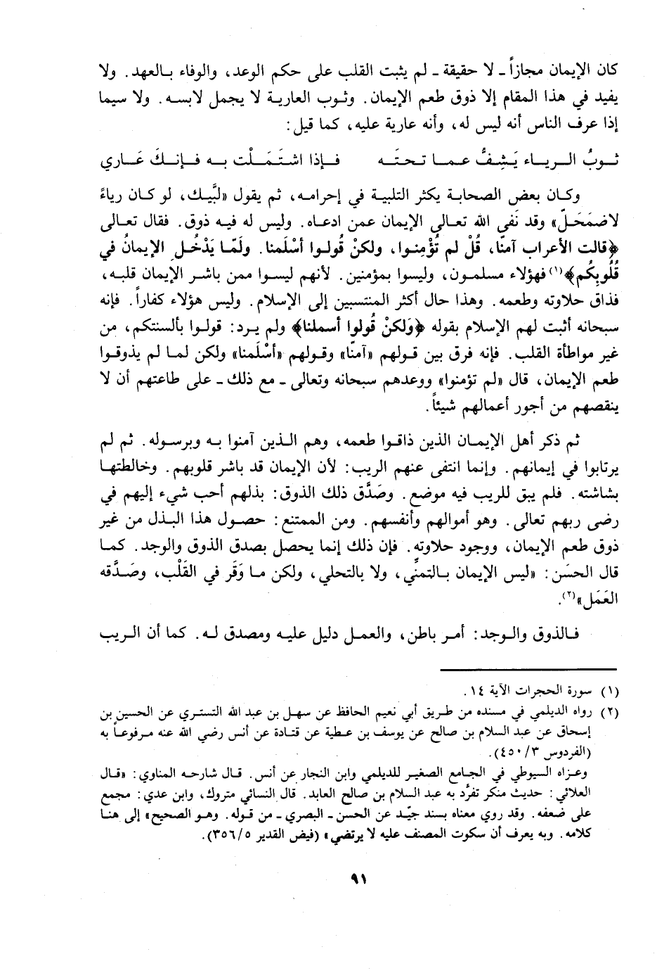 كَانَ الْإِيمَانُ مَجَازًا - لَا حَقِيقَةً - لَمْ يَثْبُتِ الْقَلْبُ عَلَى حُكْمِ الْوَعْدِ، وَالْوَفَاءِ بِالْعَهْدِ. وَلَا يُفِيدُ فِي هَذَا الْمَقَامِ إِلَّا ذَوْقُ طَعْمِ الْإِيمَانِ. وَثَوْبُ الْعَارِيَةِ لَا يُجَمِّلُ لَابِسَهُ. وَلَا سِيَّمَا إِذَا عَرَفَ النَّاسُ أَنَّهُ لَيْسَ لَهُ، وَأَنَّهُ عَارِيَةٌ عَلَيْهِ، كَمَا قِيلَ: