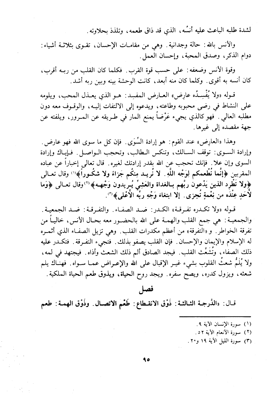 وَهَذَا الْعَارِضُ عِنْدَ الْقَوْمِ: هُوَ إِرَادَةُ السِّوَى. فَإِنَّ كُلَّ مَا سِوَى اللَّهِ فَهُوَ عَارِضٌ. وَإِرَادَةُ السِّوَى: تُوقِفُ السَّالِكَ، وَتُنَكِّسُ الطَّالِبَ، وَتَحْجُبُ الْوَاصِلَ. فَإِيَّاكَ وَإِرَادَةَ السِّوَىوَإِنْ عَلَا. فَإِنَّكَ تُحْجَبُ عَنِ اللَّهِ بِقَدْرِإِرَادَتِكَ لِغَيْرِهِ. قَالَ تَعَالَى إِخْبَارًا عَنْ عِبَادِهِ الْمُقَرَّبِينَ {إِنَّمَا نُطْعِمُكُمْ لِوَجْهِ اللَّهِ لَا نُرِيدُ مِنْكُمْ جَزَاءً وَلَا شُكُورًا} [الإنسان: 9] وَقَالَ تَعَالَى {وَلَا تَطْرُدِ الَّذِينَ يَدْعُونَ رَبَّهُمْ بِالْغَدَاةِ وَالْعَشِيِّ يُرِيدُونَ وَجْهَهُ} [الأنعام: 52] وَقَالَ تَعَالَى {وَمَا لِأَحَدٍ عِنْدَهُ مِنْ نِعْمَةٍ تُجْزَى - إِلَّا ابْتِغَاءَ وَجْهِ رَبِّهِ الْأَعْلَى} [الليل: 19 - 20] .