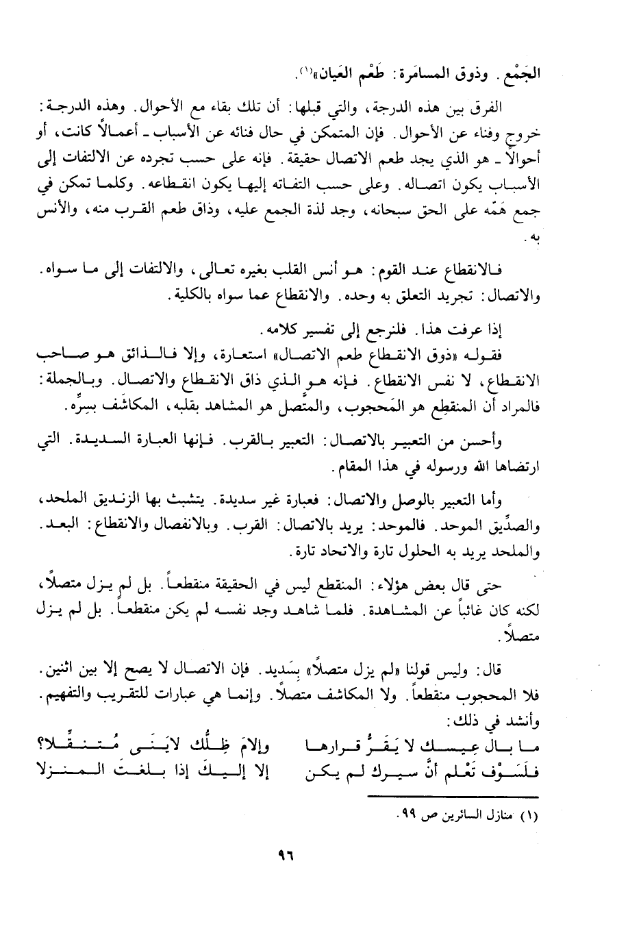 الْفَرْقُ بَيْنَ هَذِهِ الدَّرَجَةِ، وَالَّتِي قَبْلَهَا: أَنَّ تِلْكَ بَقَاءٌ مَعَ الْأَحْوَالِ. وَهَذِهِ الدَّرَجَةُ: خُرُوجٌ وَفَنَاءٌ عَنِ الْأَحْوَالِ. فَإِنَّ الْمُتَمَكِّنَ فِي حَالِ فَنَائِهِ عَنِ الْأَسْبَابِ - أَعْمَالًا كَانَتْ، أَوْ أَحْوَالًا - هُوَ الَّذِي يَجِدُ طَعْمَ الِاتِّصَالِ حَقِيقَةً. فَإِنَّهُ عَلَى حَسَبِ تَجَرُّدِهِ عَنِ الِالْتِفَاتِ إِلَى الْأَسْبَابِ يَكُونُ اتِّصَالُهُ. وَعَلَى حَسَبِ الْتِفَاتِهِ إِلَيْهَا يَكُونُ انْقِطَاعُهُ. وَكُلَّمَا تَمَكَّنَ فِي جَمْعِ هَمِّهِ عَلَى الْحَقِّ سُبْحَانَهُ، وَجَدَ لَذَّةَ الْجَمْعِ عَلَيْهِ، وَذَاقَ طَعْمَ الْقُرْبِ مِنْهُ، وَالْأُنْسِ بِهِ.
