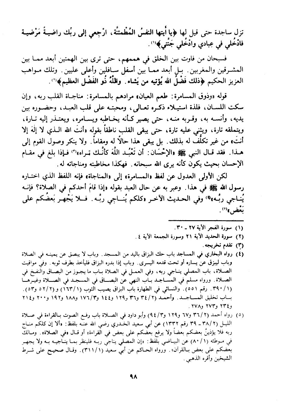 لَكِنَّ الْأَوْلَى الْعُدُولُ عَنْ لَفْظِ الْمُسَامَرَةِ إِلَى الْمُنَاجَاةِ فَإِنَّهُ اللَّفْظُ الَّذِي اخْتَارَهُ رَسُولُ اللَّهِ - صَلَّى اللَّهُ عَلَيْهِ وَسَلَّمَ - فِي هَذَا. وَعَبَّرَ بِهِ عَنْ حَالِ الْعَبْدِ بِقَوْلِهِ «إِذَا قَامَ أَحَدُكُمْ فِي الصَّلَاةِ فَإِنَّهُ يُنَاجِي رَبَّهُ» وَفِي الْحَدِيثِ الْآخَرِ «كُلُّكُمْ يُنَاجِي رَبَّهُ. فَلَا يَجْهَرْ بَعْضُكُمْ عَلَى بَعْضٍ» .