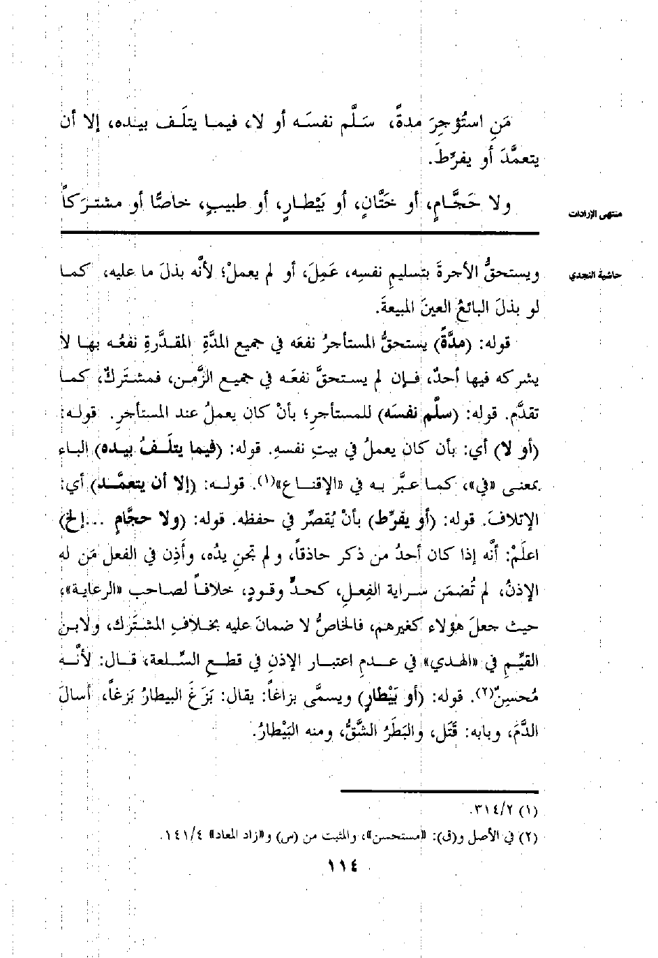مَنْ اسْتَأْجَرَ مُدَّةَ سَلَّمَ نَفْسَهُ وَلَا فِيمَا يَتْلَفُ بِيَدِهِ إلَّا أَنْ يَتَعَمَّدَ أَوْ يُفَرِّطَ وَلَا حَجَّامٍ أَوْ خَتَّانٌ أَوْ بَيْطَارٍ أَوْ طَبِيبٍ خَاصًّا أَوْ مُشْتَرَكًا