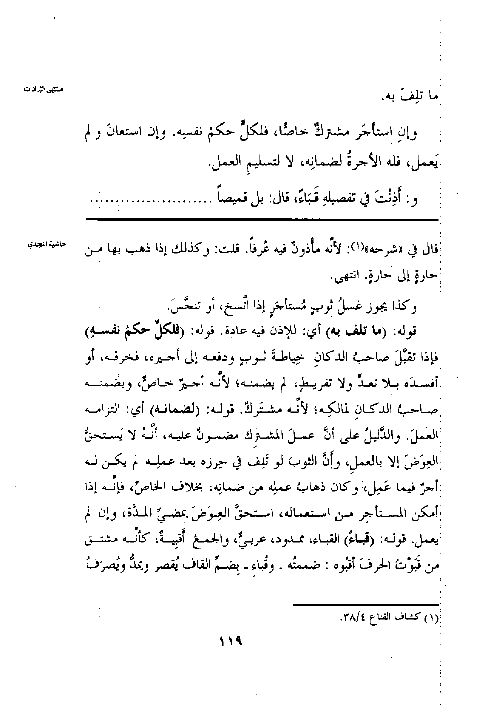 مَا تَلِفَ بِهِ وَإِنْ اسْتَأْجَرَ مُشْتَرِكٌ خَاصًّا فَلِكُلٍّ حُكْمُ نَفْسِهِ وَإِنْ اسْتَعَانَ وَلَمْ يَعْمَلْ فَلَهُ الْأُجْرَةُ لِضَمَانِهِ لَا لِتَسْلِيمِ الْعَمَلِ وأَذِنْتَ فِي تَفْصِيلِهِ قَبَاءً قَالَ بَلْ قَمِيصًا