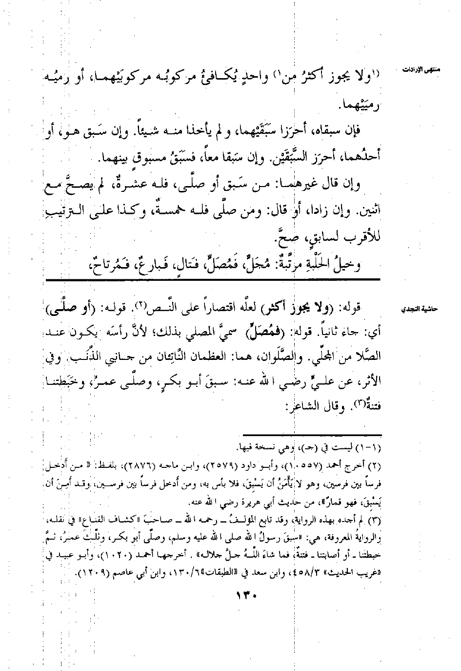 وَلَا يَجُوزُ أَكْثَرَ مِنْ وَاحِدٍ يُكَافِئُ مَرْكُوبُهُ مَرْكُوبَيْهِمَا أَوْ رَمْيُهُ رَمْيَهُمَا فَإِنْ سَبَقَاهُ أَحْرَزَا سَبَقَيْهِمَا وَلَمْ يَأْخُذَا مِنْهُ شَيْئًا وَإِنْ سَبَقَ هُوَ أَوْ أَحَدُهُمَا أَحْرَزَ السَّبَقَيْنِ وَإِنْ سَبَقَا مَعًا فَسَبْقُ مَسْبُوقٍ بَيْنَهُمَا وَإِنْ قَالَ غَيْرُهُمَا مَنْ سَبَقَ أَوْ صَلَّى فَلَهُ عَشَرَةٌ لَمْ يَصِحَّ مَعَ اثْنَيْنِ وَإِنْ زَادَ أَوْ قَالَ وَمَنْ صَلَّى فَلَهُ خَمْسَةٌ وَكَذَا عَلَى التَّرْتِيبِ لِلْأَقْرَبِ السَّابِقِ صَحَّ وَخَيْلُ الْحَلْبَةِ مُرَتَّبَةٌ مُجَلٍّ فَمُصَلٍّ فَتَالٍ فَبَارِعٌ فَمُرْتَاحٌ
