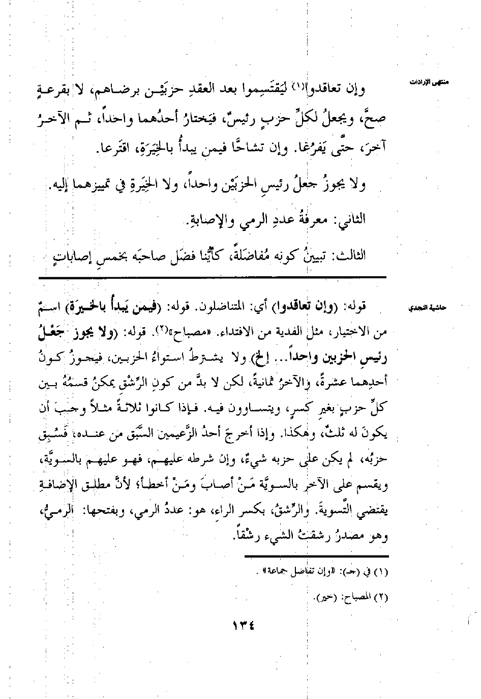 وَإِنْ تَعَاقَدُوا لِيَقْتَسِمُوا بَعْدَ الْعَقْدِ حِزْبَيْنِ بِرِضَاهُمْ لَا بِقُرْعَةٍ. صَحَّ وَاحِدًا ثُمَّ الْآخَرُ آخَرُ حَتَّى يَفْرُغَا وَإِنْ تَشَاحَّا فِيمَنْ يَبْدَأُ بِالْخِيَرَةِ اقْتَرَعَا وَلَا يَجُوزُ جَعْلُ رَئِيسِ الْحِزْبَيْنِ وَاحِدًا وَلَا الْخِيَرَةِ فِي تَمْيِيزِهِمَا إلَيْهِ الثَّانِي: مَعْرِفَةُ عَدَدِ الرَّمْيِ والْإِصَابَةِ الثَّالِثُ: تَبْيِينُ كَوْنِهِ مُفَاضَلَةً كأَيْنَا فَضَلَ صَاحِبَهُ بِخَمْسِ إصَابَاتٍ