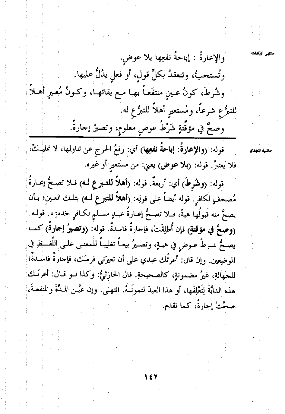 وَالْإِعَارَةُ إبَاحَةُ نَفْعِهَا بِلَا عِوَضٍ وَتُسْتَحَبُّ وَتَنْعَقِدُ بِكُلِّ قَوْلٍ أَوْ فِعْلٍ يَدُلُّ عَلَيْهَا وَشُرِطَ كَوْنُ عَيْنٍ مُنْتَفَعًا بِهَا مَعَ بَقَائِهَا وكَوْنُ مُعِيرٍ أَهْلًا لِلتَّبَرُّعِ شَرْعًا ومُسْتَعِيرٍ أَهْلًا لِلتَّبَرُّعِ لَهُ وَصَحَّ فِي مُؤَقَّتَةٍ شَرْطُ عِوَضٍ مَعْلُومٍ، وَتَصِيرُ إجَارَةً