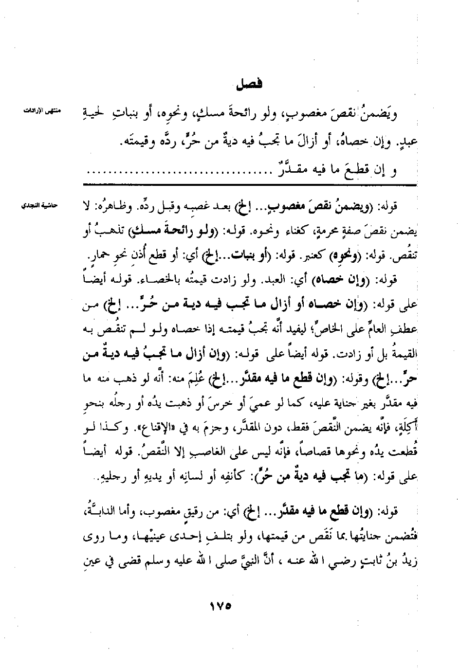 وَيَضْمَنُ نَقْصَ مَغْصُوبٍ وَلَوْ رَائِحَةَ مِسْكٍ وَنَحْوِهِ أَوْ نَبَاتِ لِحْيَةِ عَبْدٍ وَإِنْ خَصَاهُ أَوْ أَزَالَ مَا تَجِبُ فِيهِ دِيَةٌ مِنْ حُرٍّ رَدَّهُ وقِيمَتَهُ وَإِنْ قَطَعَ مَا فِيهِ مُقَدَّرٌ