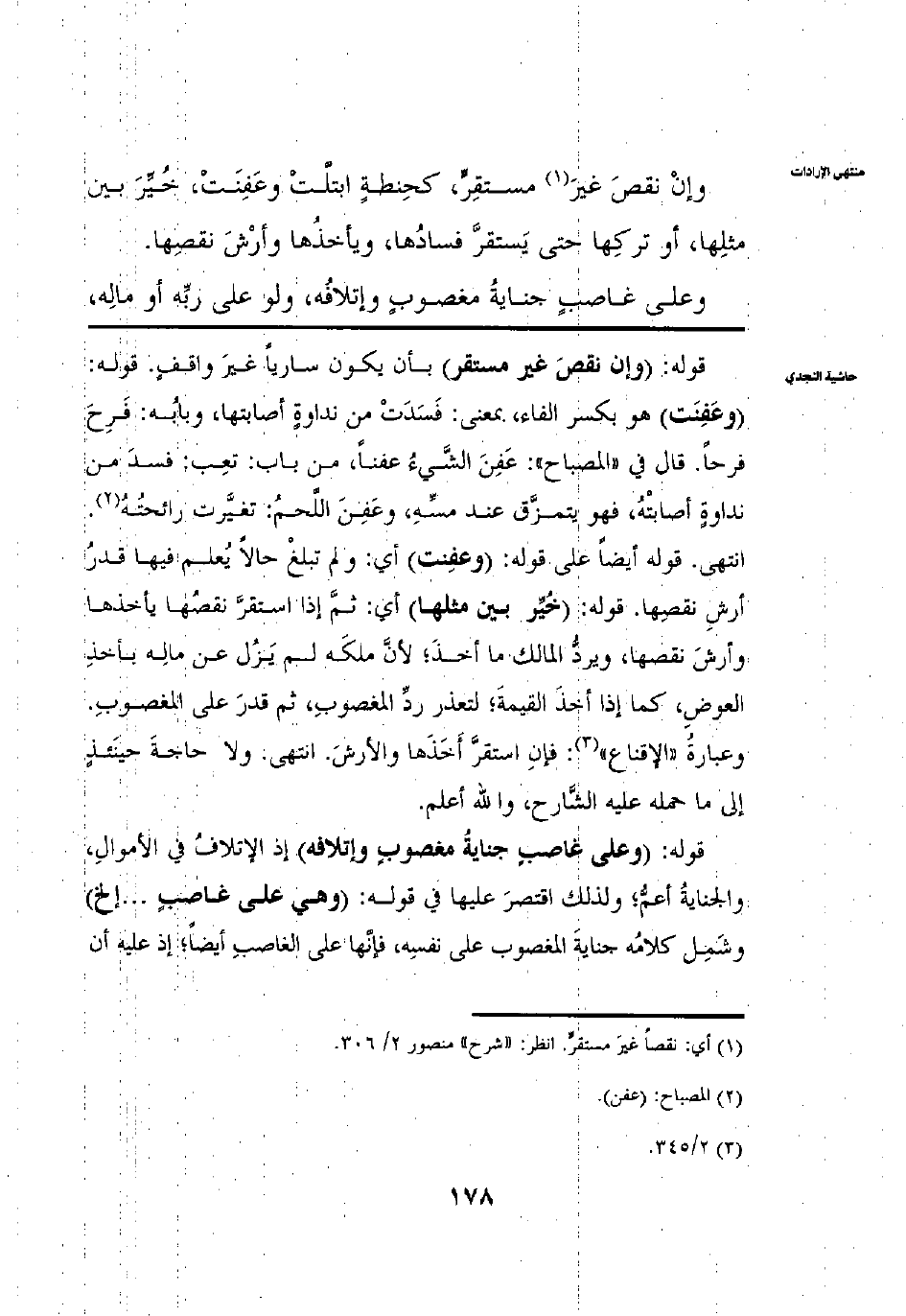 وَإِنْ نَقَصَ غَيْرَ مُسْتَقِرٍّ كَحِنْطَةٍ ابْتَلَّتْ وَعَفِنَتْ خُيِّرَ بَيْنَ مِثْلِهَا أَوْ تَرْكِهَا حَتَّى يَسْتَقِرَّ فَسَادُهَا وَيَأْخُذَهَا وَأَرْشَ نَقْصِهَا وَعَلَى غَاصِبٍ جِنَايَةُ مَغْصُوبٍ وإتْلَافُهُ وَلَوْ عَلَى رَبِّهِ أَوْ مَالِهِ