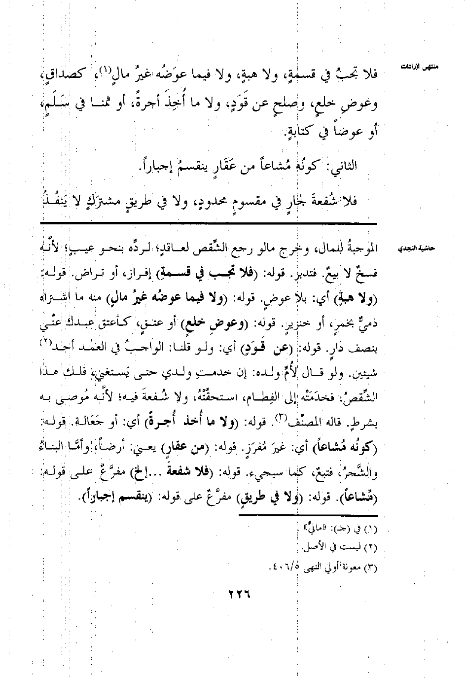 فَلَا تَجِبُ فِي قِسْمِهِ وَلَا هِبَةٍ وَلَا فِيمَا عِوَضُهُ غَيْرُ مَالِيٍّ كَصَدَاقٍ وَعِوَضُ خُلْعٍ وصُلْحٍ عَنْ قَوَدٍ وَلَا مَا أَخَذَ أُجْرَةً أَوْ ثَمَنًا فِي سَلَمٍ أَوْ عِوَضًا فِي كِتَابَةٍ الثَّانِي كَوْنُهُ مُشَاعًا مِنْ عَقَارٍ يَنْقَسِمُ إجْبَارًا فَلَا شُفْعَةَ لِجَارٍ فِي مَقْسُومٍ مَحْدُودٍ وَلَا فِي طَرِيقٍ مُشْتَرَكٍ لَا يَنْفُذُ
