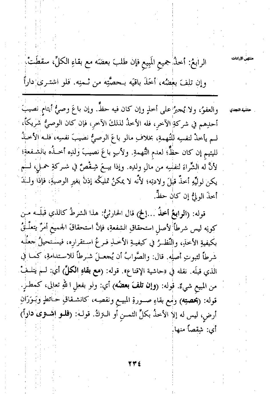 الرابع: أَخْذُ جَمِيعِ الْمَبِيعِ فَإِنْ طَلَبَ بَعْضَهُ مَعَ بَقَاءِ الْكُلِّ سَقَطَتْ وَإِنْ تَلِفَ بَعْضُهُ أَخَذَ بَاقِيَهُ بِحِصَّتِهِ مِنْ ثَمَنِهِ فَلَوْ اشْتَرَى دَارًا