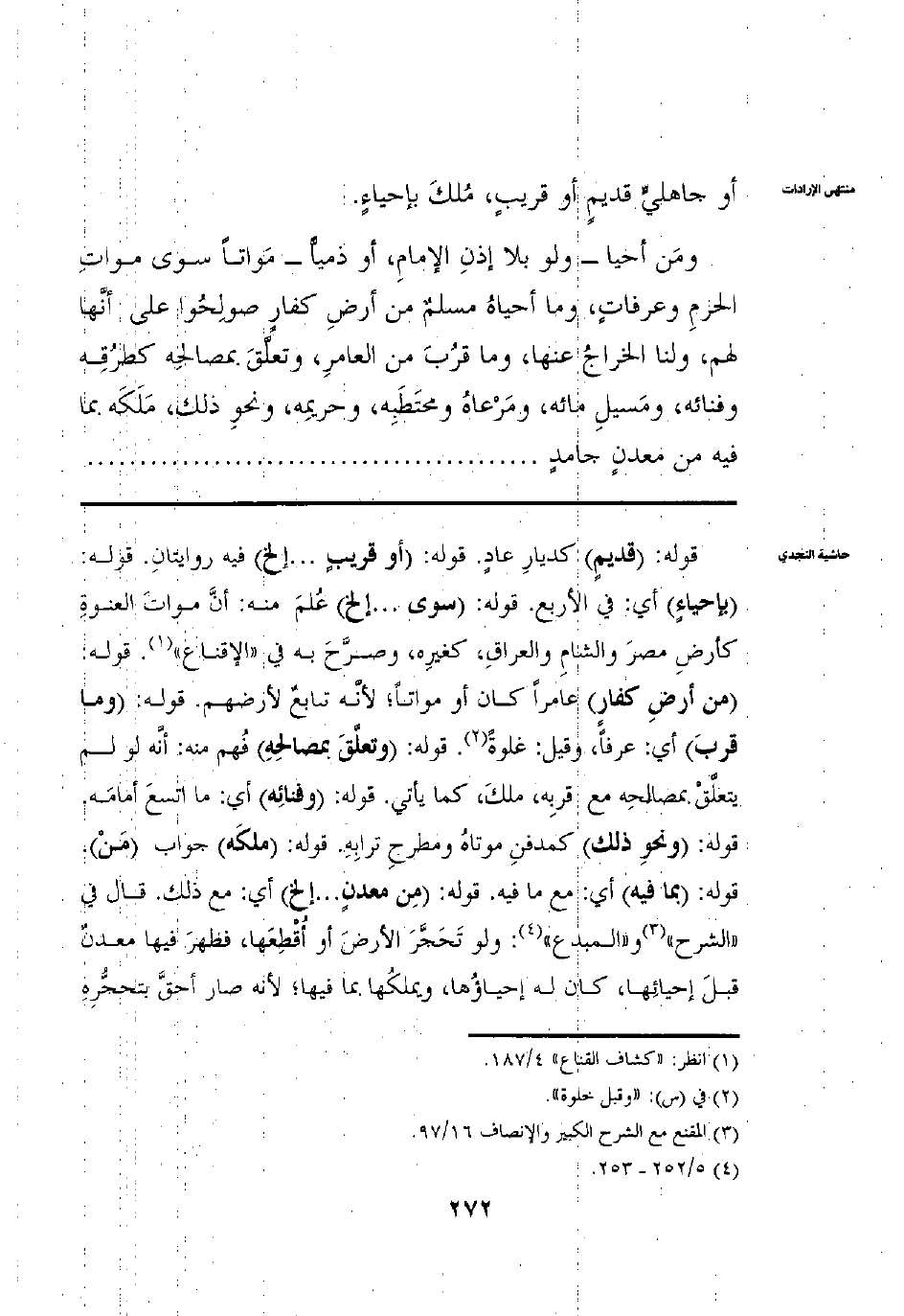 أَوْ جَاهِلِيٍّ قَدِيمٍ أَوْ قَرِيبٍ مُلِكَ بِإِحْيَاءٍ وَمَنْ أَحْيَا وَلَوْ بِلَا إذْنِ الْإِمَامِ أَوْ ذِمِّيًّا مَوَاتًا سِوَى مَوَاتِ الْحَرَمِ وَعَرَفَاتٍ، ومَا أَحْيَاهُ مُسْلِمٌ مِنْ أَرْضِ كُفَّارٍ صُولِحُوا عَلَى أَنَّهَا لَهُمْ وَلَنَا الْخَرَاجُ عَنْهَا، ومَا قَرُبَ مِنْ الْعَامِرِ وَتَعَلَّقَ بِمَصَالِحِهِ كَطُرُقِهِ وَفِنَائِهِ وَمَسِيلِ مَائِهِ وَمَرْعَاهُ وَمُحْتَطَبِهِ وَحَرِيمِهِ وَنَحْوِ ذَلِكَ مَلَكَهُ بِمَا فِيهِ مِنْ مَعْدِنٍ جَامِدٍ