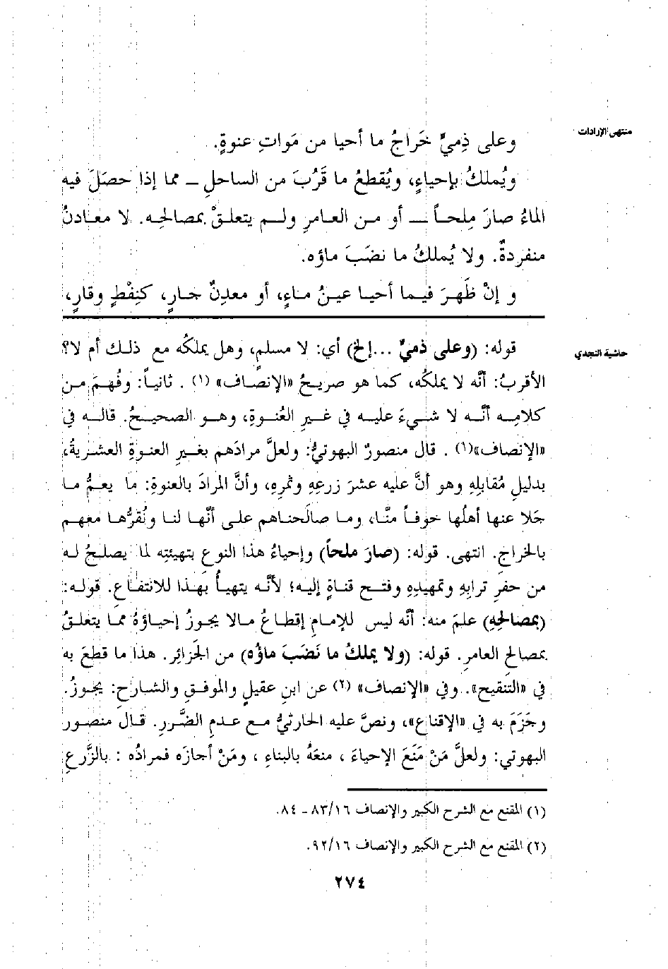 وَعَلَى ذِمِّيٍّ خَرَاجُ مَا أَحْيَا مِنْ مَوَاتٍ عَنْوَةً وَيُمْلَكُ بِإِحْيَاءٍ وَيُقْطَعُ مَا قَرُبَ مِنْ السَّاحِلِ مِمَّا إذَا حَصَلَ فِيهِ الْمَاءُ صَارَ مِلْحًا أَوْ مِنْ الْعَامِرِ وَلَمْ يَتَعَلَّقْ بِمَصَالِحِهِ لَا مَعَادِنُ مُنْفَرِدَةٌ وَلَا يُمْلَكُ مَا نَضَبَ مَاؤُهُ وَإِنْ ظَهَرَ فِيمَا أَحْيَا عَيْنُ مَاءٍ أَوْ مَعْدِنٍ جَارٍ كَنَفْطٍ وَقَارٍ