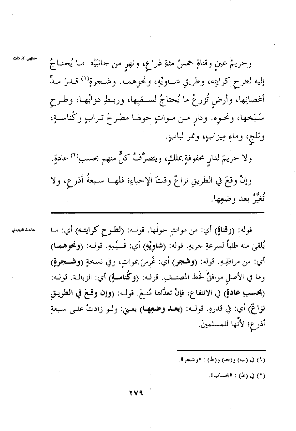 وَحَرِيمُ عَيْنٍ وَقَنَاةٍ خَمْسُمِائَةِ ذِرَاعٍ ونَهْرٍ مِنْ جَانِبَيْهِ مَا يَحْتَاجُ إلَيْهِ لِطَرْحِ كِرَايَتِهِ وَطَرِيقِ شَاوِيهِ وَنَحْوِهِمَا وشَجَرَةٍ قَدْرُ مَدِّ أَغْصَانِهَا وأَرْضٍ تُزْرَعُ مَا تَحْتَاجُ لِسَقْيِهَا وَرَبْطِ دَوَابِّهَا وَطَرْحِ سَبَخِهَا وَنَحْوِهِ ودَارٍ مِنْ مَوَاتٍ حَوْلَهَا مَطْرَحُ تُرَابٍ وَكُنَاسَةٍ وَثَلْجٍ وَمَاءِ مِيزَابٍ وَمَمَرٍّ لِبَابٍ وَلَا حَرِيمَ لِدَارٍ مَحْفُوفَةٍ بِمِلْكٍ وَيَتَصَرَّفُ كُلٌّ مِنْهُمْ بِحَسَبِ عَادَةٍ وَإِنْ وَقَعَ فِي الطَّرِيقِ نِزَاعٌ وَقْتَ الْإِحْيَاءِ فَلَهَا سَبْعَةُ أَذْرُعٍ وَلَا تُغَيَّرُ بَعْدَ وَضْعِهَا