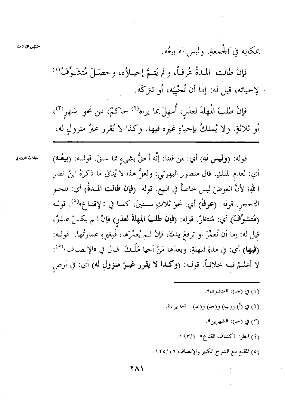 بِمَكَانِهِ فِي الْجُمُعَةِ وَلَيْسَ لَهُ بَيْعُهُ فَإِنْ طَالَتْ الْمُدَّةُ عُرْفًا وَلَمْ يَتِمَّ إحْيَاؤُهُ وَحَصَلَ مُتَشَوِّقٍ لِإِحْيَائِهِ قِيلَ لَهُ إمَّا أَنْ تُحْيِيَهُ أَوْ تَتْرُكَهُ فَإِنْ طَلَبَ الْمُهْلَةَ لِعُذْرٍ أُمْهِلَ مَا يَرَاهُ حَاكِمٌ مِنْ نَحْوِ شَهْرٍ أَوْ ثَلَاثَةٍ وَلَا يَمْلِكُ بِإِحْيَاءِ غَيْرِهِ فِيهَا وَكَذَا لَا يُقَرِّرُ غَيْرُ مَنْزُولٍ لَهُ