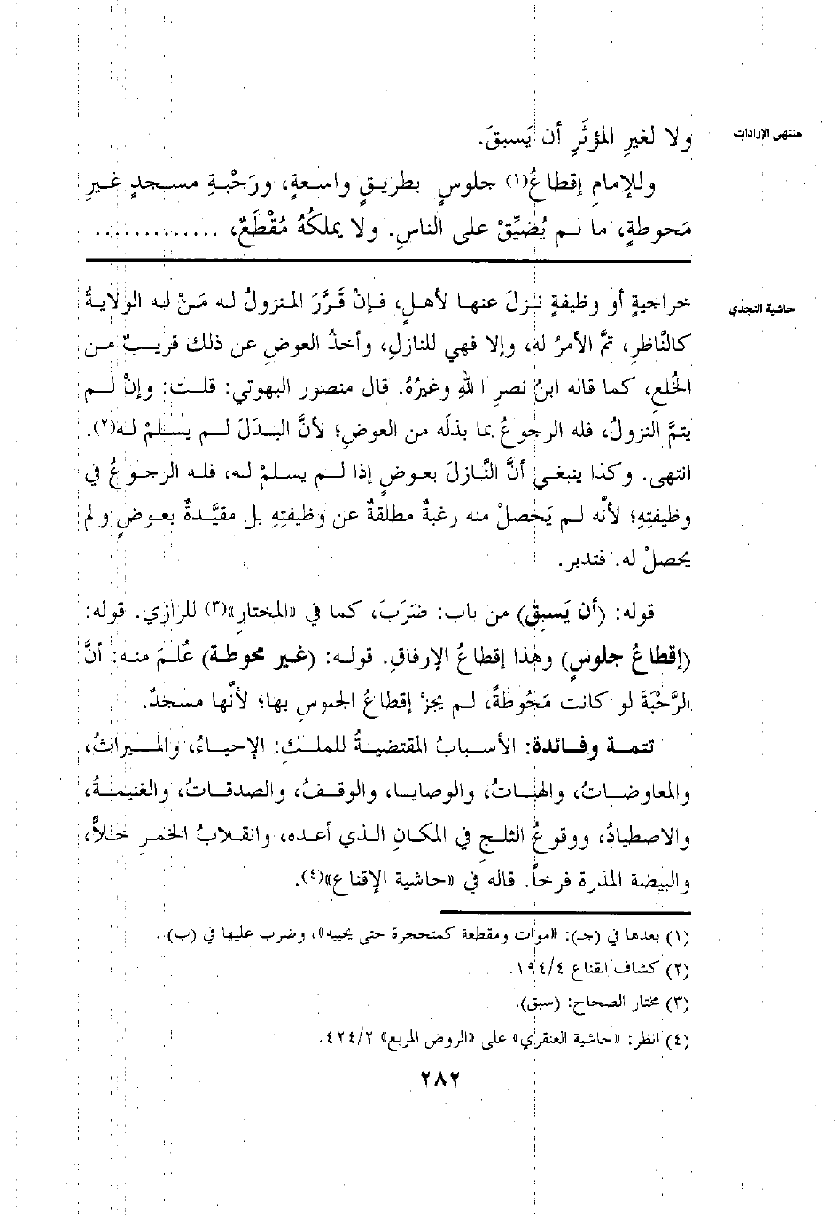 ولَا لِغَيْرِ الْمُؤْثَرِ أَنْ يَسْبِقَ: وَلِلْإِمَامِ إقْطَاعُ جُلُوسٍ بِطَرِيقٍ وَاسِعَةٍ وَرَحْبَةِ مَسْجِدٍ غَيْرِ مَحُوطَةٍ مَا لَمْ يَضِقْ عَلَى النَّاسِ وَلَا يَمْلِكُهُ مُقْطَعٌ