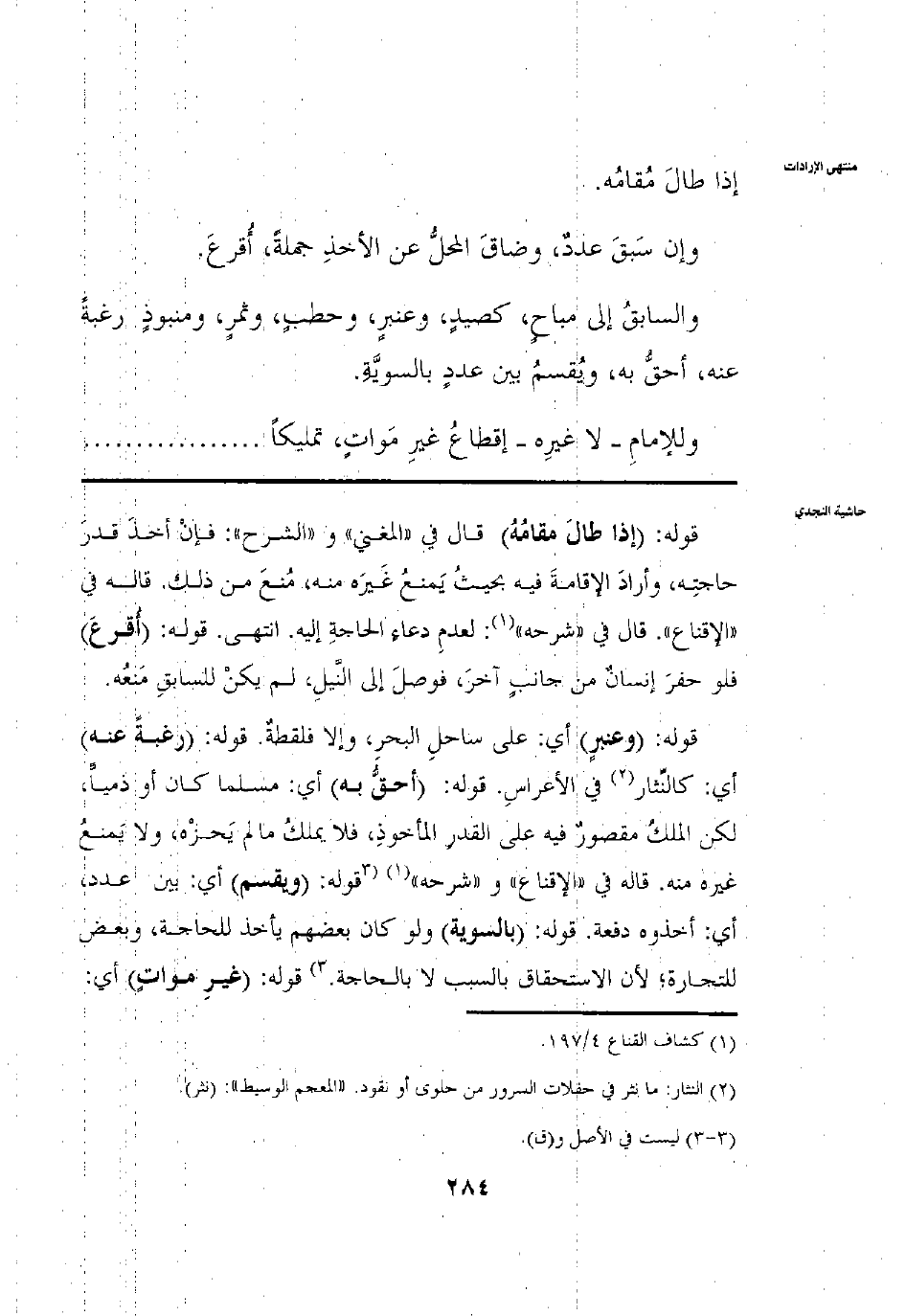 إذَا طَالَ مُقَامُهُ وَإِنْ سَبَقَ عَدَدٌ وَضَاقَ الْمَحِلُّ عَنْ الْآخِذِ جُمْلَةً أُقْرِعَ وَالسَّابِقُ إلَى مُبَاحٍ كَصَيْدٍ وَعَنْبَرٍ وَحَطَبٍ وَثَمَرٍ وَمَنْبُوذٍ رَغْبَةً عَنْهُ أَحَقُّ بِهِ وَيُقَسَّمُ بَيْنَ عَدَدٍ بِالسَّوِيَّةِ وَلِلْإِمَامِ لَا غَيْرِهِ إقْطَاعُ غَيْرِ مَوَاتٍ تَمْلِيكًا
