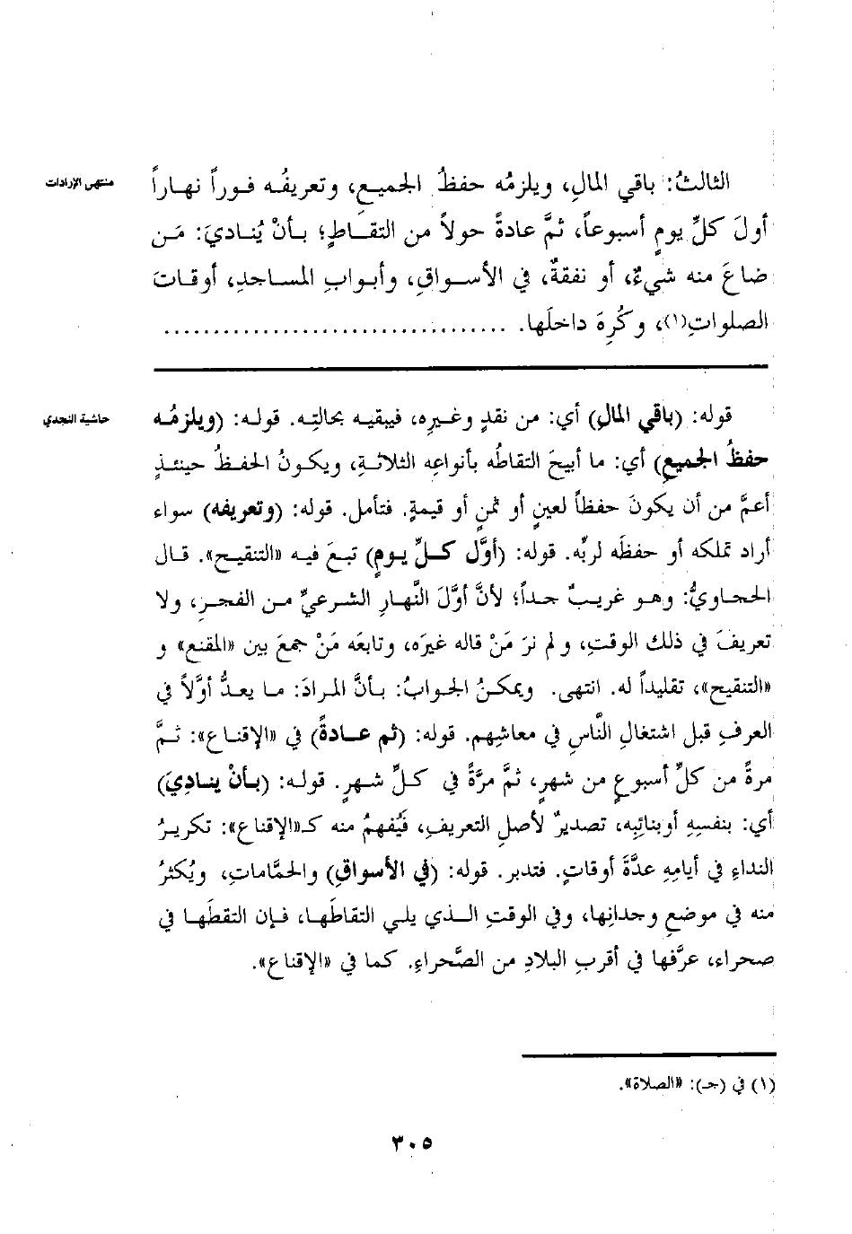 الثَّالِث: بَاقِي الْمَالِ وَيَلْزَمُهُ حِفْظُ الْجَمِيعِ وتَعْرِيفُهُ فَوْرًا نَهَارًا أَوَّلَ كُلِّ يَوْمٍ أُسْبُوعًا ثُمَّ عَادَةً حَوْلًا مِنْ الْتِقَاطِهِ بِأَنْ يُنَادِي: مَنْ ضَاعَ مِنْهُ شَيْءٌ أَوْ نَفَقَةٌ فِي الْأَسْوَاقِ وَأَبْوَابِ الْمَسَاجِدِ وَكُرِهَ دَاخِلَهَا،