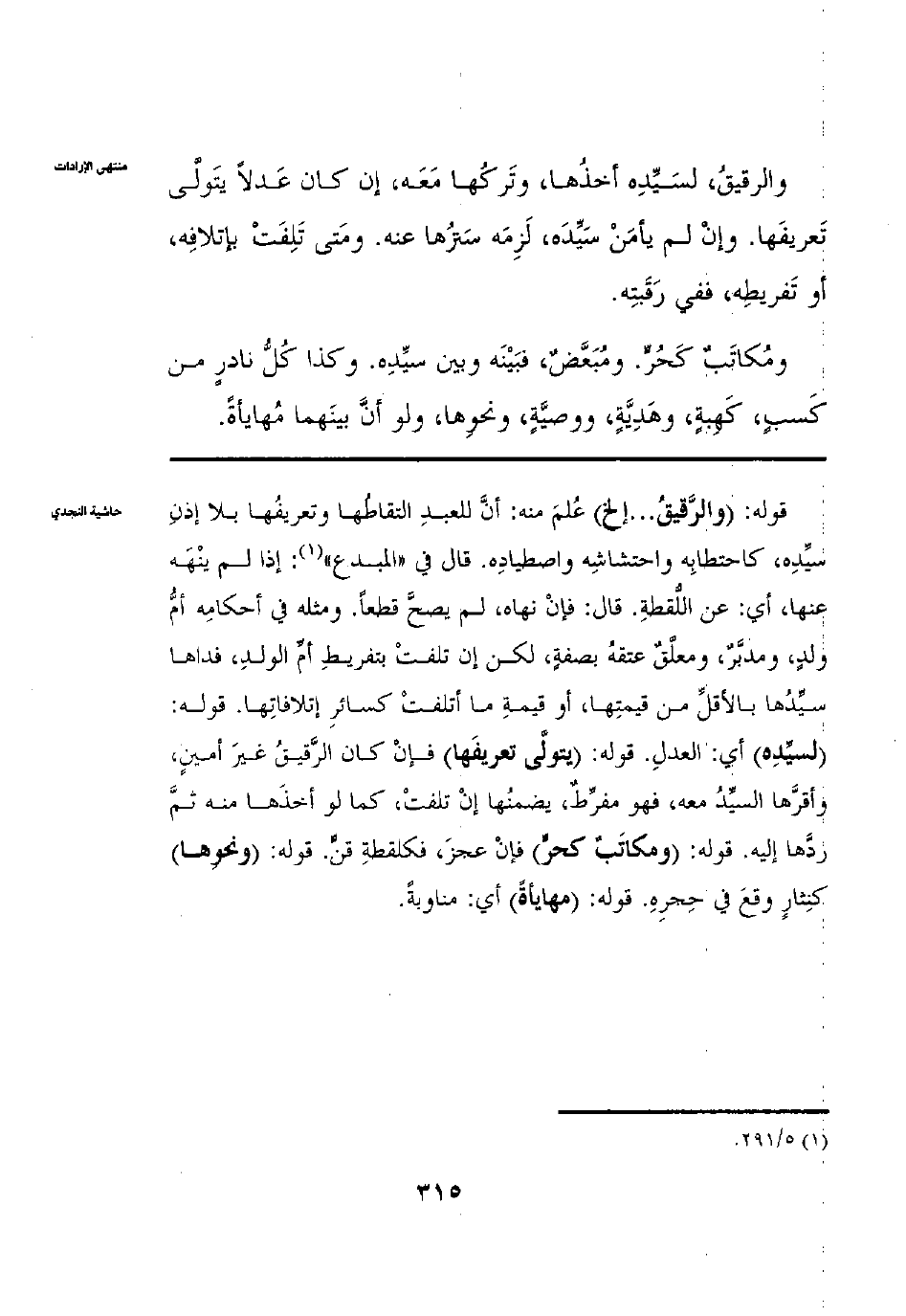 وَالرَّقِيقُ وَلِسَيِّدِهِ أَخْذُهَا وتَرْكُهَا مَعَهُ إنْ كَانَ عَدْلًا يَتَوَلَّى تَعْرِيفَهَا، وَإِنْ لَمْ يَأْمَنْ سَيِّدَهُ لَزِمَهُ سَتْرُهَا عَنْهُ وَمَتَى تَلِفَتْ بِإِتْلَافِهِ أَوْ تَفْرِيطِهِ ففِي رَقَبَتِهِ وَمُكَاتَبٌ كَحُرٍّ ومُبَعَّضٌ فبَيْنَهُ وَبَيْنَ سَيِّدِهِ وَكَذَا كُلُّ نَادِرٍ مِنْ كَسْبٍ كَهِبَةٍ وَهَدِيَّةٍ وَوَصِيَّةٍ وَنَحْوِهَا وَلَوْ أَنَّ بَيْنَهُمَا مُهَايَأَةً