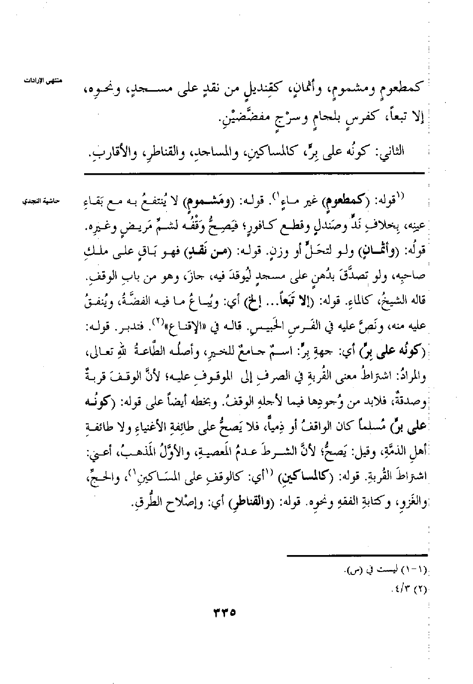 كَمَطْعُومٍ وَمَشْمُومٍ وأَثْمَانٍ كَقِنْدِيلٍ مِنْ نَقْدٍ عَلَى مَسْجِدٍ وَنَحْوِهِ إلَّا تَبَعًا كَفَرَسٍ بِلِجَامٍ وَسَرْجٍ مُفَضَّضَيْنِ الثَّانِي: كَوْنُهُ عَلَى بِرٍّ كَالْمَسَاكِينِ وَالْمَسَاجِدِ وَالْقَنَاطِرِ وَالْأَقَارِبِ