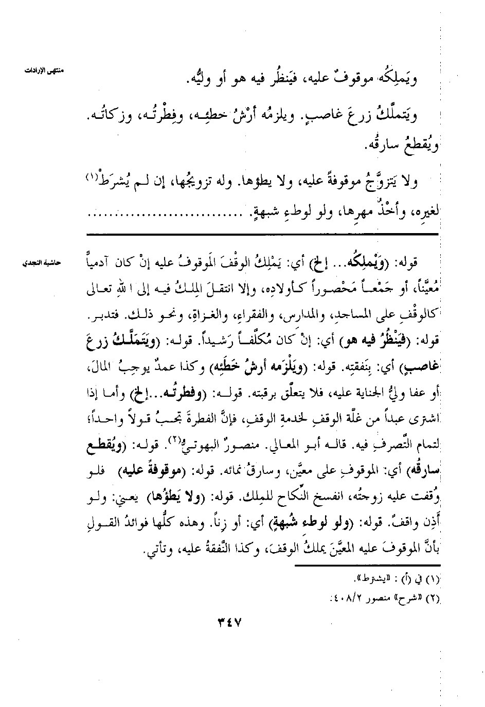 وَيَمْلِكُهُ مَوْقُوفٌ عَلَيْهِ فَيَنْظُرُ فِيهِ هُوَ أَوْ وَلِيُّهُ وَيَتَمَلَّكُ زَرْعَ غَاصِبٍ وَيَلْزَمُهُ أَرْشُ خَطَئِهِ وفِطْرَتُهُ وزَكَاتُهُ وَيُقْطَعُ سَارِقُهُ وَلَا يَتَزَوَّجُ مَوْقُوفَةً عَلَيْهِ وَلَا يَطَؤُهَا وَلَهُ تَزْوِيجُهَا إنْ لَمْ يَشْتَرِطْ لِغَيْرِهِ وأَخْذُ مَهْرِهَا وَلَوْ لِوَطْءِ شُبْهَةٍ