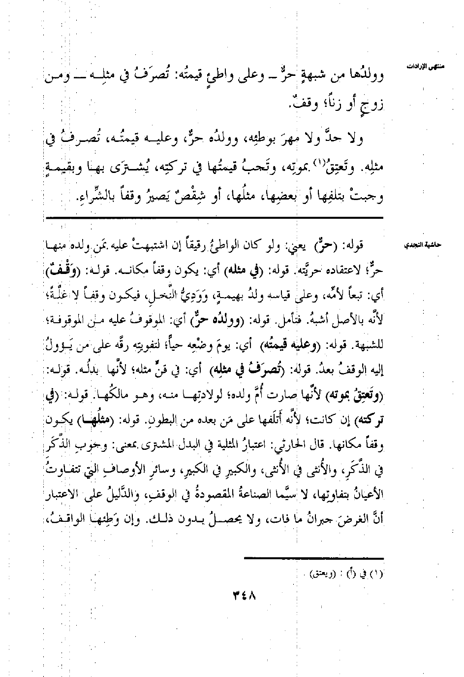 وَوَلَدُهَا مِنْ شُبْهَةٍ حُرٌّ وَعَلَى وَاطِئٍ قِيمَتُهُ تُصْرَفُ فِي مِثْلِهِ ومِنْ زَوْجٍ أَوْ زِنًا وَقْفٌ وَلَا حَدَّ وَلَا مَهْرَ بِوَطْئِهِ وَوَلَدُهُ حُرٌّ وَعَلَيْهِ قِيمَتُهُ تُصْرَفُ فِي مِثْلِهِ وَتُعْتَقُ بِمَوْتِهِ وَتَجِبُ قِيمَتُهَا فِي تَرِكَتِهِ يَشْتَرِي بِهَا وبِقِيمَةٍ وَجَبَتْ بِتَلَفِهَا أَوْ بَعْضِهَا مِثْلُهَا أَوْ شِقْصٌ يَصِيرُ وَقْفًا بِالشِّرَاءِ