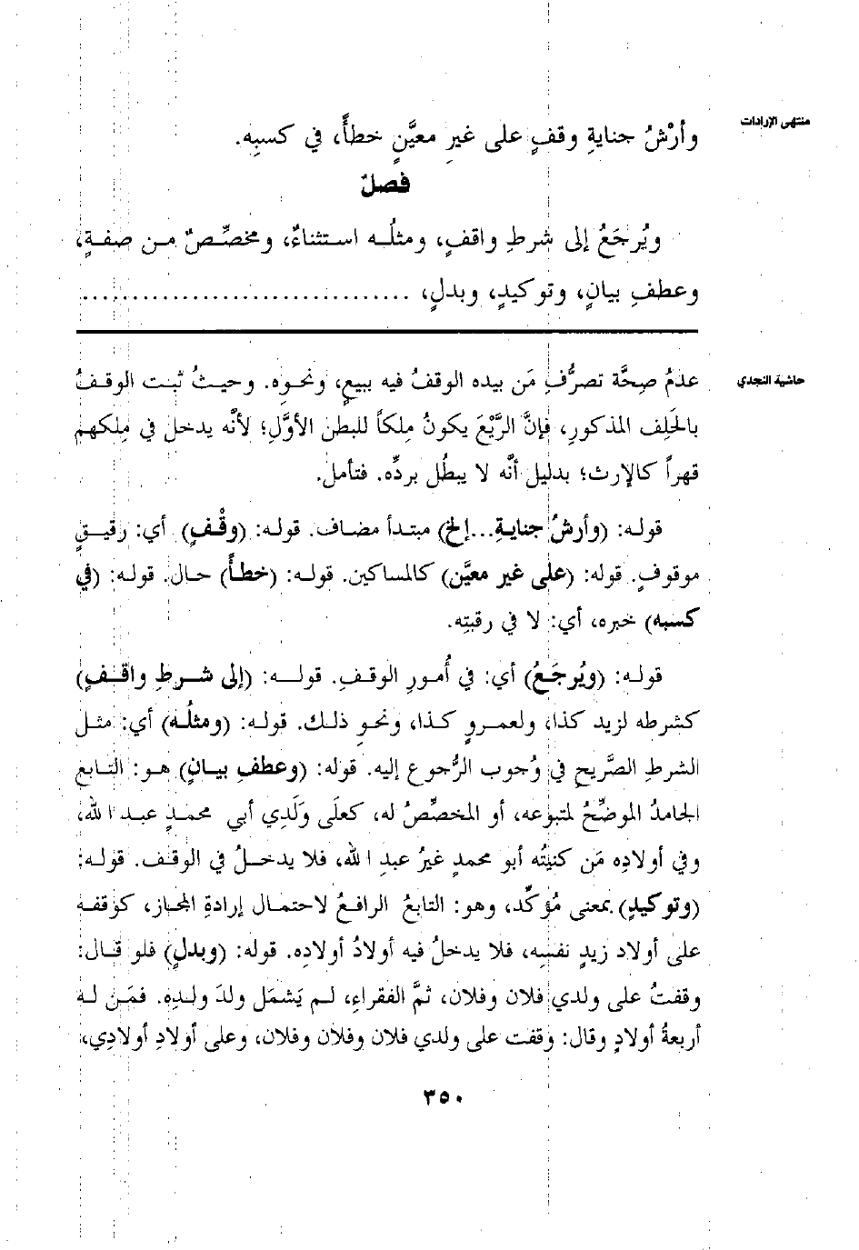 وَيُرْجَعُ بِالْبِنَاءِ لِلْمَفْعُولِ إلَى شَرْطِ وَاقِفٍ وَمِثْلُهُ اسْتِثْنَاءٌ ومُخَصَّصٌ مِنْ صِفَةٍ وعَطْفِ بَيَانٍ وتَوْكِيدٍ وبَدَلٍ