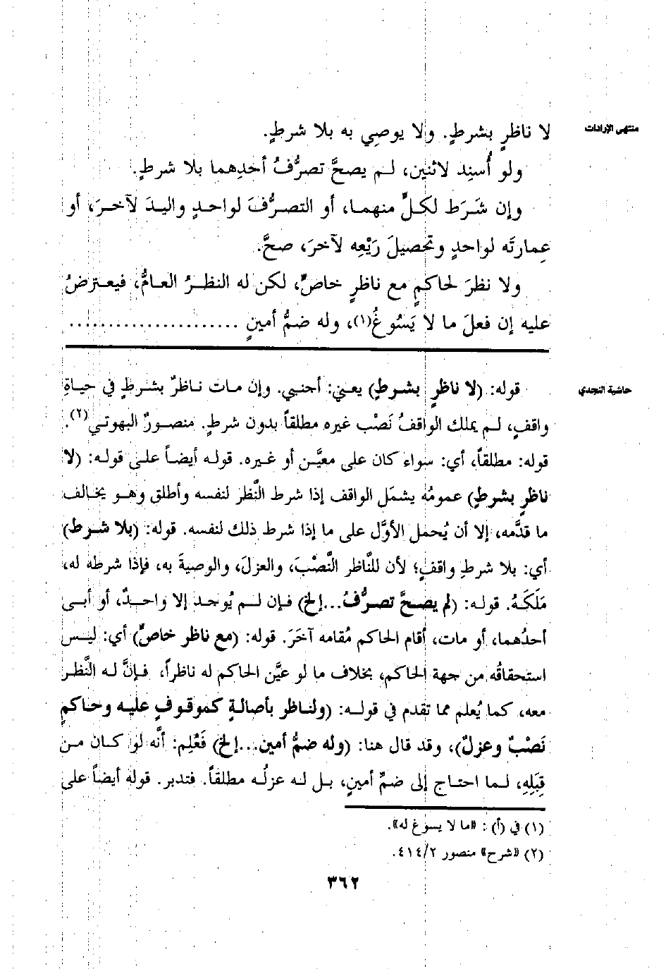 لَا نَاظِرٍ بِشَرْطٍ وَلَا يُوصِي بِهِ بِلَا شَرْطِ وَلَوْ أَسْنَدَ لِاثْنَيْنِ لَمْ يَصِحَّ تَصَرُّفُ أَحَدِهِمَا بِلَا شَرْطِ وَاقِفٍ وَإِنْ شَرَطَ لِكُلٍّ مِنْهُمَا أَوْ التَّصَرُّفَ لِوَاحِدٍ والْيَدَ لِآخَرَ أَوْ عِمَارَتَهُ لِوَاحِدٍ وتَحْصِيلَ رِيعِهِ لِآخَرَ صَحَّ وَلَا نَظَرَ لِحَاكِمٍ مَعَ نَاظِرٍ خَاصٍّ لَكِنْ لَهُ النَّظَرُ الْعَامُّ فَيُعْتَرَضُ عَلَيْهِ إنْ فَعَلَ مَا لَا يَسُوغُ وَلَهُ ضَمُّ أَمِينٍ