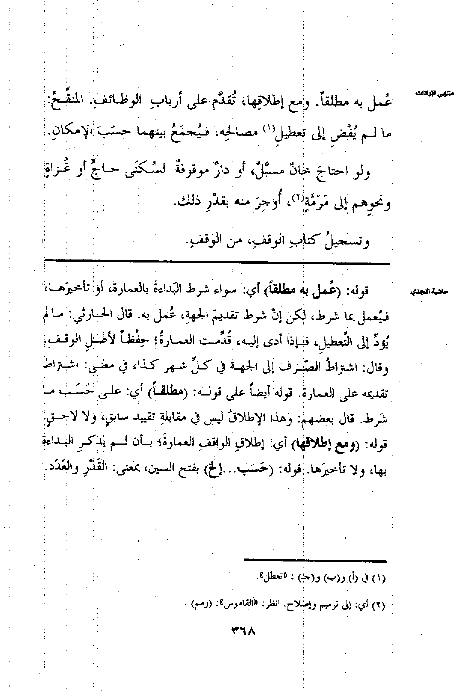 عُمِلَ بِهِ مُطْلَقًا وَمَعَ إطْلَاقِهَا تُقَدَّمُ عَلَى أَرْبَابِ الْوَظَائِفِ الْمُنَقِّحُ: مَا لَمْ يُفْضِ إلَى تَعْطِيلِ مَصَالِحِهِ فَيَجْمَعُ بَيْنَهُمَا حَسَبَ الْإِمْكَانَ وَلَوْ احْتَاجَ خَانٌ مُسَبَّلٌ أَوْ دَارٌ مَوْقُوفَةٌ لِسُكْنَى حَاجٍّ أَوْغُزَاةٍ وَنَحْوِهِمْ إلَى مَرَمَّةٍ أُوجِرَ مِنْهُ بِقَدْرِ ذَلِكَ وَتَسْجِيلِ كِتَابِ الْوَقْفِ مِنْ الْوَقْفِ